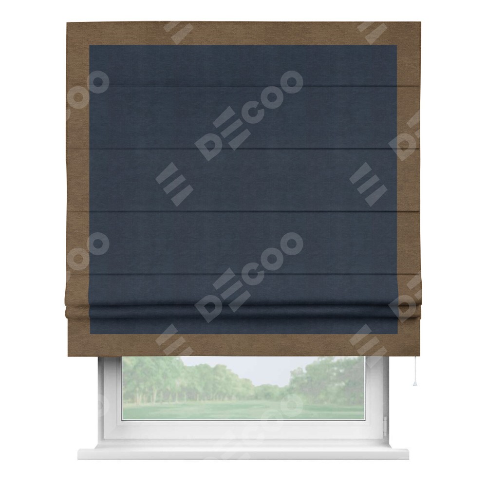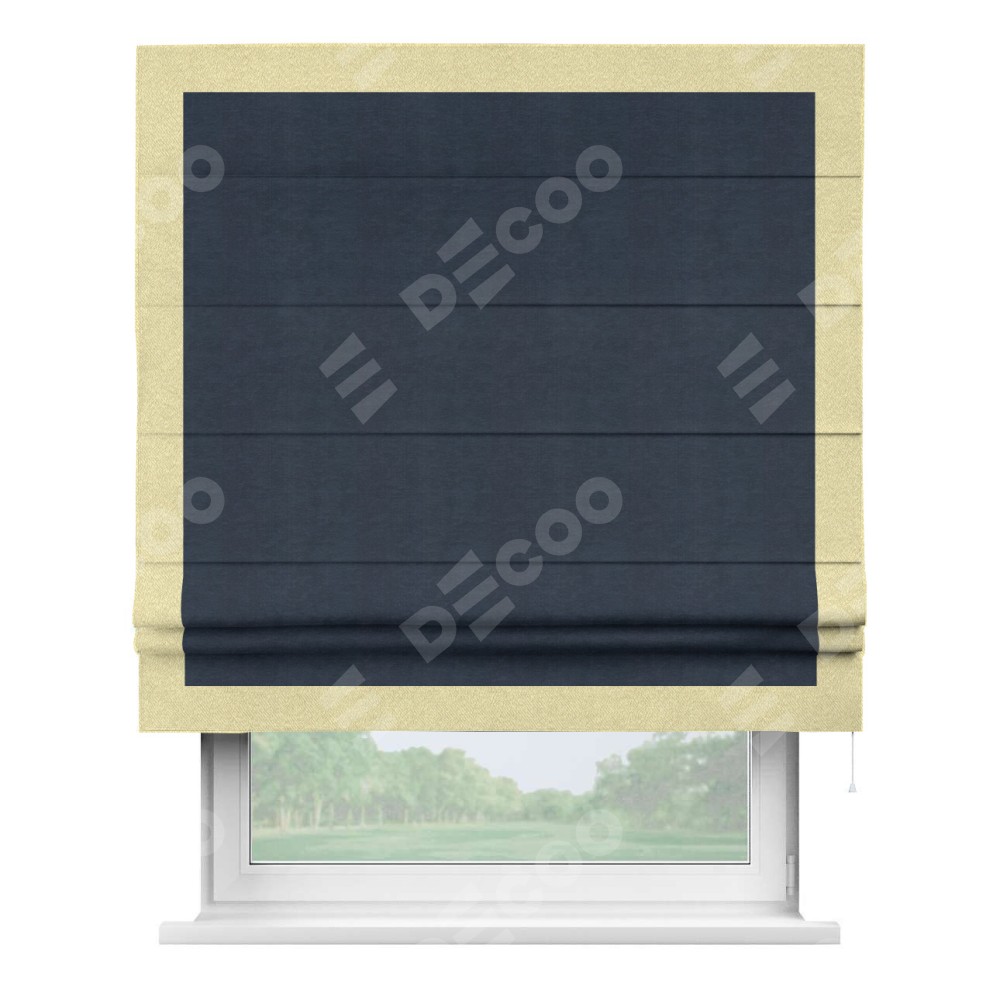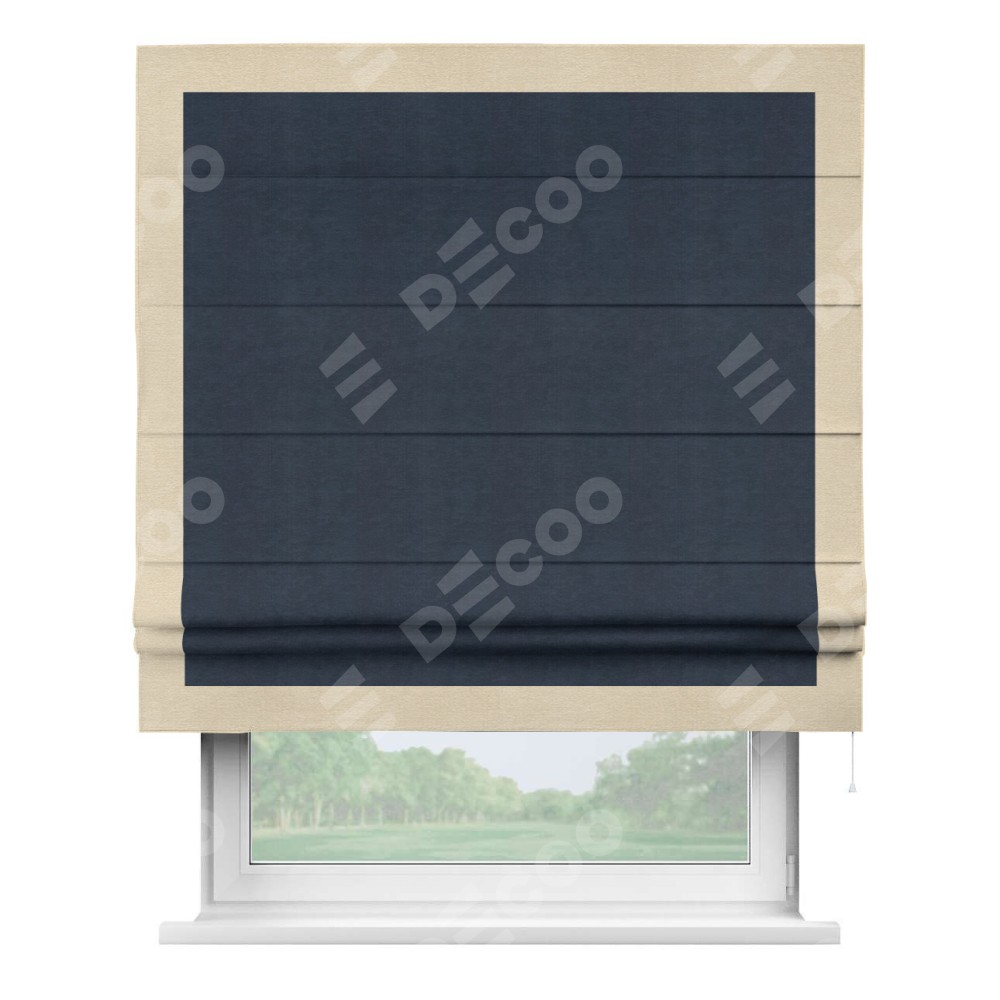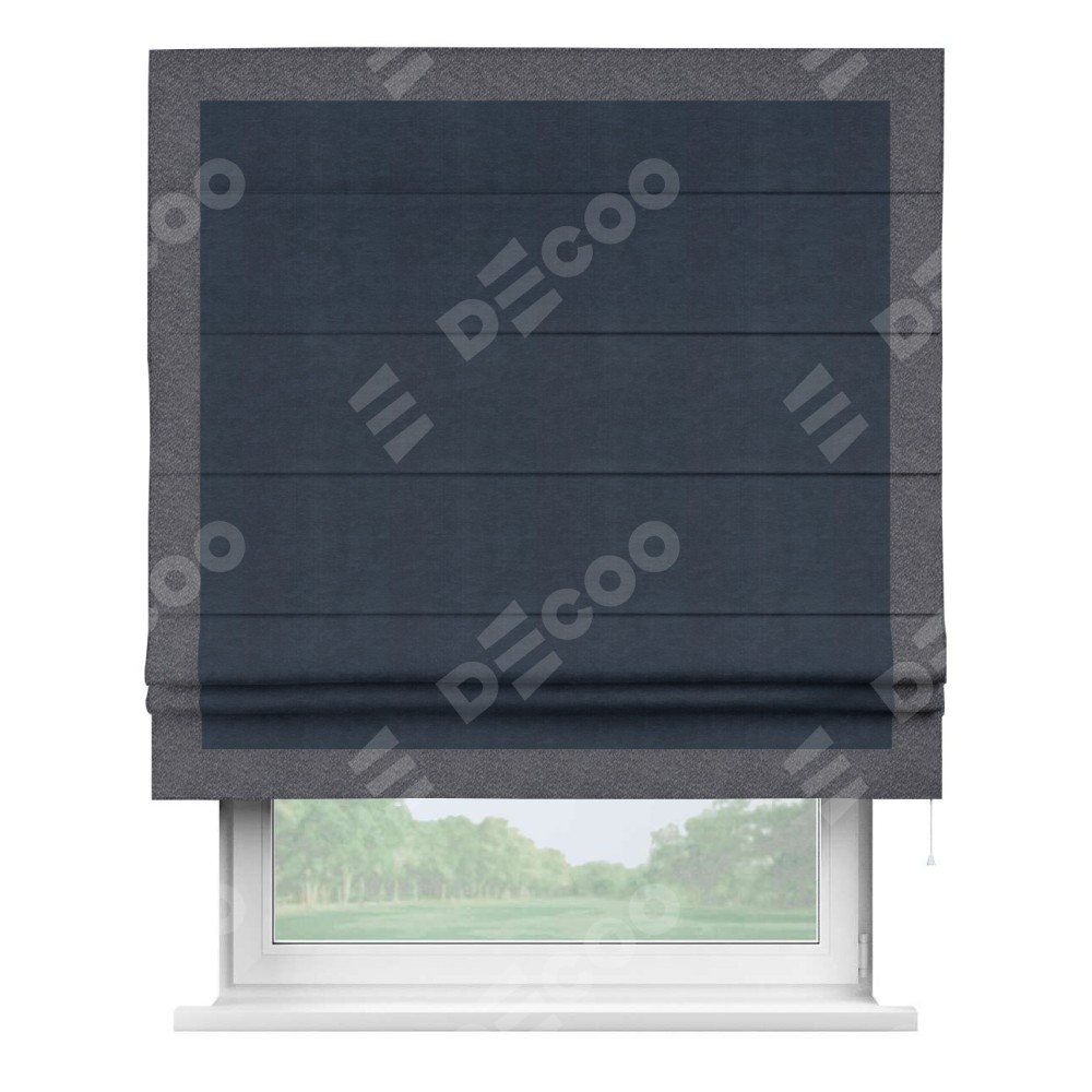 Римская штора производителя «Cortin», используется для проёма, пошита из ткани софт однотонный тёмно-синий, артикул 33111. Отделка шторы кантом «Чесс», ткань для канта используется из софта разной расцветки на выбор. Имеет универсальный механизм и подходит для монтажа: на потолок, на стену и в нишу.