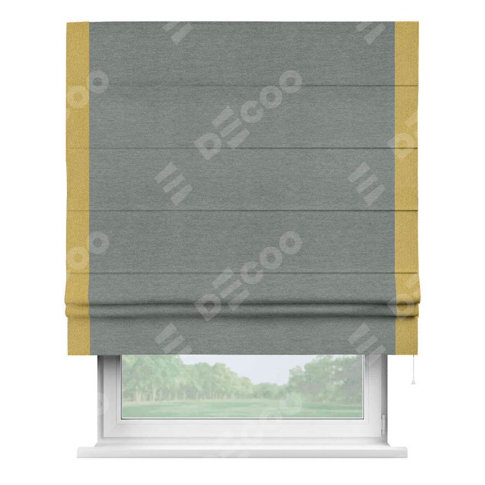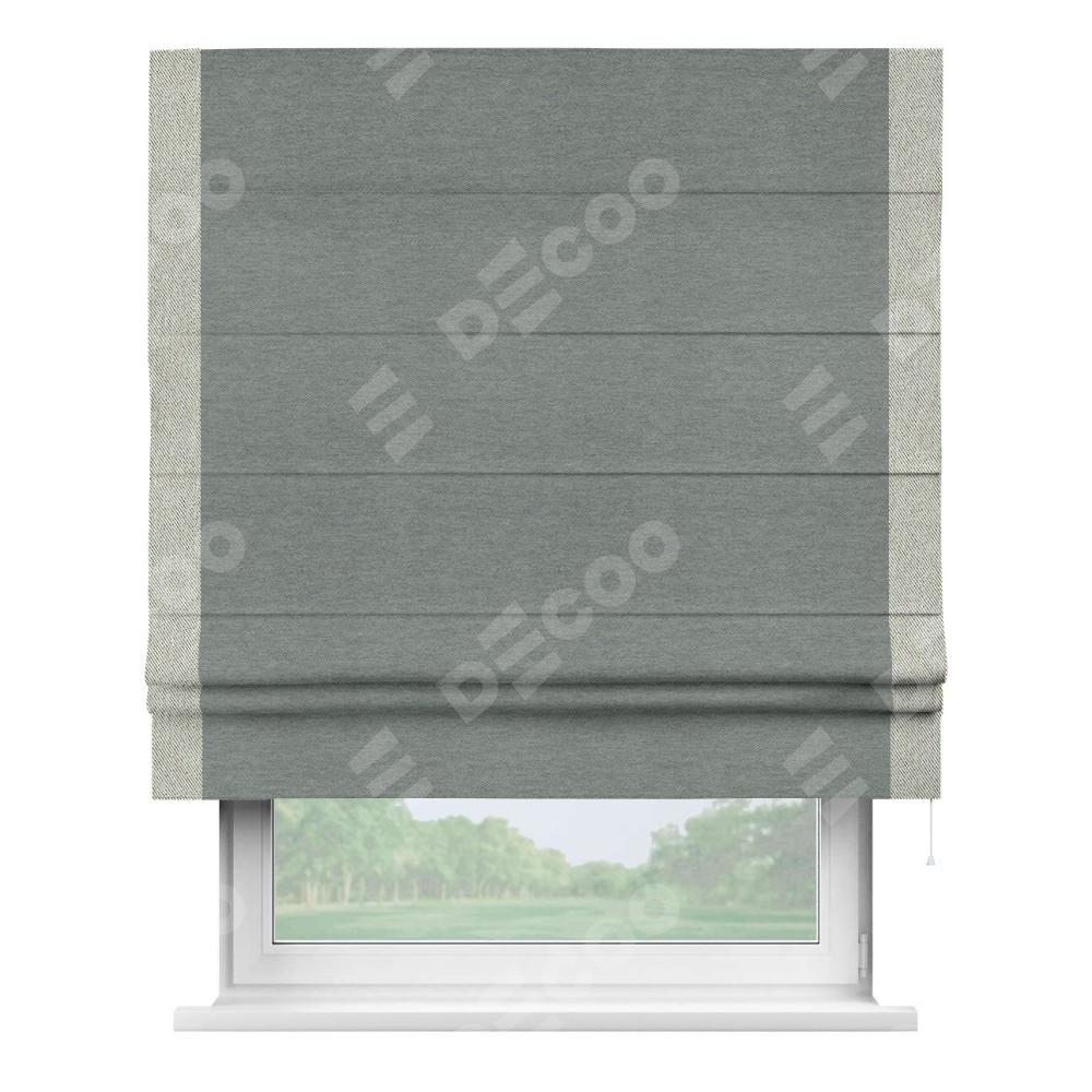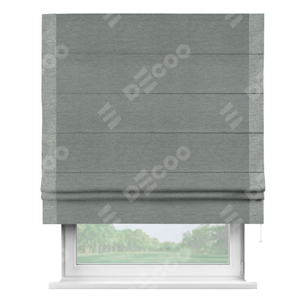 Римская штора производителя «Cortin», используется для проёма, пошита из ткани твид блэкаут серый, артикул 21577. Отделка шторы кантом «Стрим Дуо», ткань для канта используется из твида разной расцветки на выбор. Имеет универсальный механизм и подходит для монтажа: на потолок, на стену и в нишу.