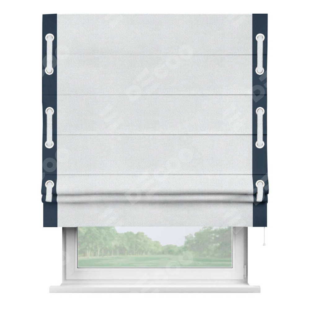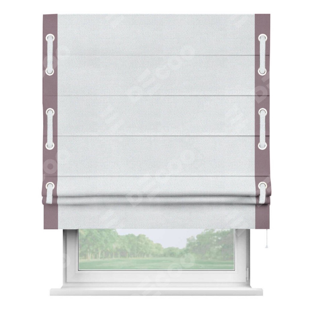 Римская штора производителя «Cortin», используется для проёма, пошита из ткани блэкаут однотонный дымчато-белый, артикул ткани 101. Отделка шторы кантом «Стрим Дуо» на кантах расположены люверсы с пояском, ткань для канта используется из блэкаута однотонного разной расцветки на выбор. Ткань для пояска обычно используется из основной ткани шторы, а так же можно сделать из любой расцветки по желанию. Имеет универсальный механизм и подходит для монтажа: на потолок, на стену и в нишу.