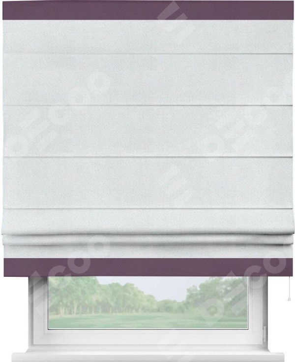 Римская штора производителя «Cortin», используется для проёма, пошита из ткани блэкаут однотонный дымчато-белый, артикул ткани 101. Отделка шторы кантом «Горизонт», ткань для канта используется из блэкаута однотонного разной расцветки на выбор. Имеет универсальный механизм и подходит для монтажа: на потолок, на стену и в нишу.