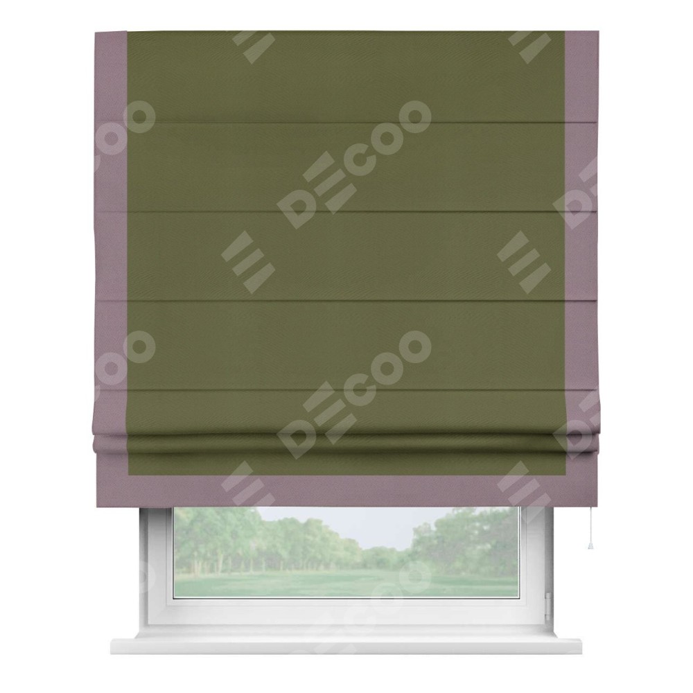 Римская штора производителя «Cortin», используется для проёма, пошита из ткани блэкаут однотонный зелёный, артикул ткани 81859. Отделка шторы кантом «Виктория», ткань для канта используется из блэкаута однотонного разной расцветки на выбор. Имеет универсальный механизм и подходит для монтажа: на потолок, на стену и в нишу.