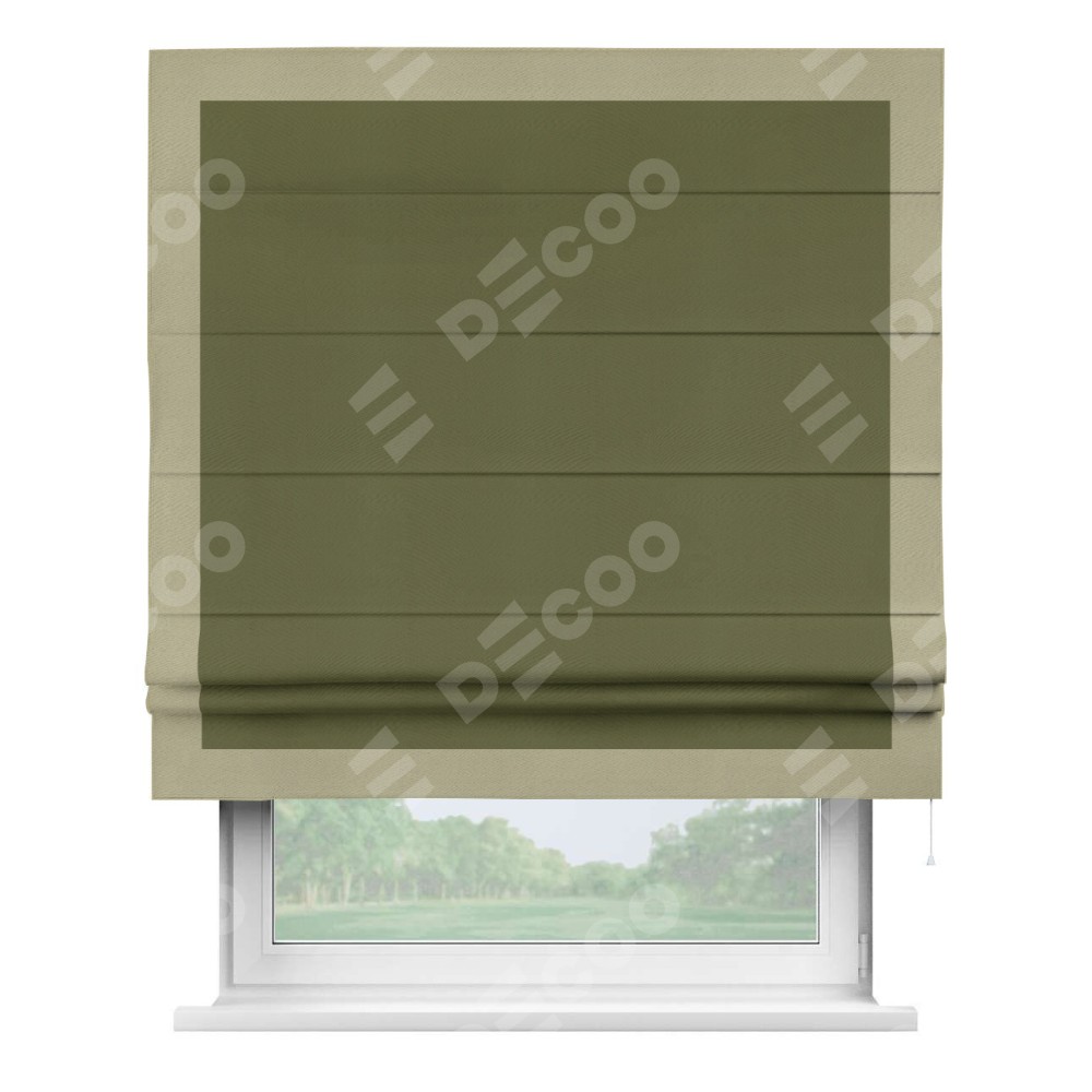 Римская штора производителя «Cortin», используется для проёма, пошита из ткани блэкаут однотонный зелёный, артикул ткани 81859. Отделка шторы кантом «Чесс», ткань для канта используется из блэкаута однотонного разной расцветки на выбор. Имеет универсальный механизм и подходит для монтажа: на потолок, на стену и в нишу.