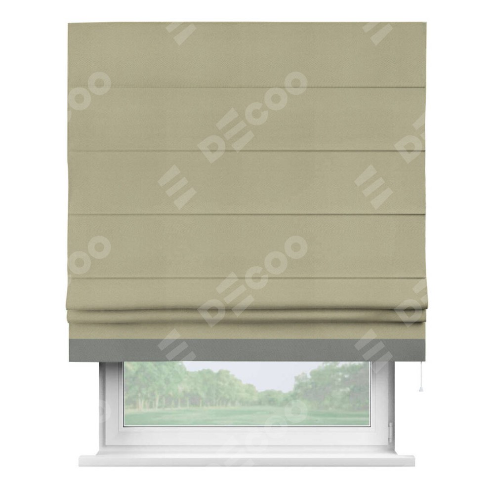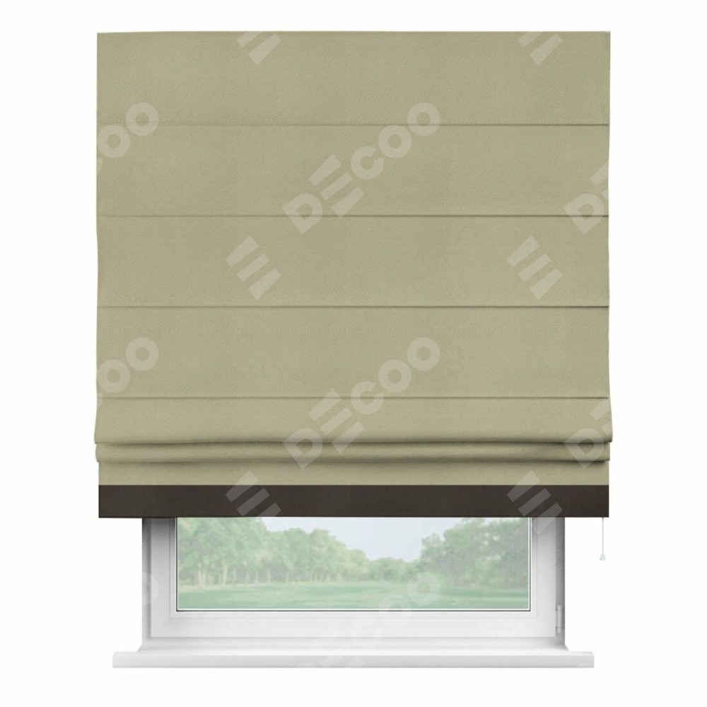 Римская штора производителя «Cortin», используется для проёма, пошита из ткани блэкаут однотонный милано капучино, артикул ткани 06. Отделка шторы кантом «Джестер», ткань для канта используется из блэкаута однотонного разной расцветки на выбор. Имеет универсальный механизм и подходит для монтажа: на потолок, на стену и в нишу.