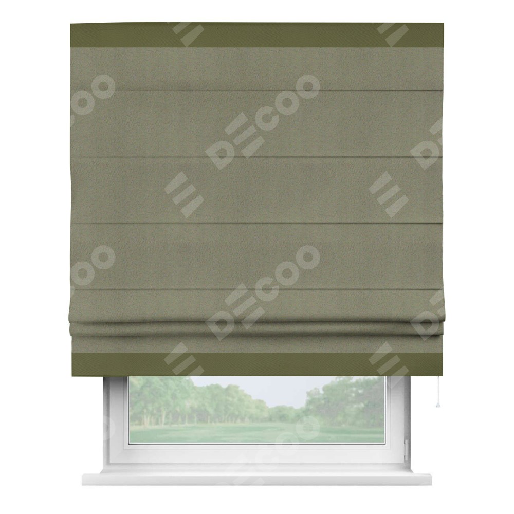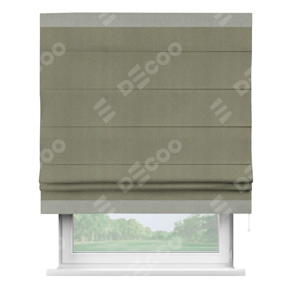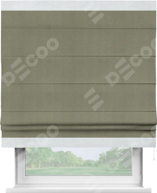 Римская штора производителя «Cortin», используется для проёма, пошита из ткани блэкаут однотонный серо-коричневый, артикул ткани 29568. Отделка шторы кантом «Горизонт», ткань для канта используется из блэкаута однотонного разной расцветки на выбор. Имеет универсальный механизм и подходит для монтажа: на потолок, на стену и в нишу.