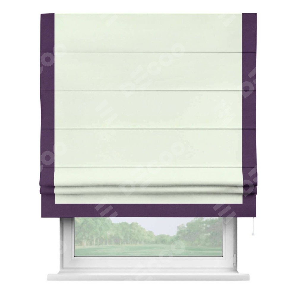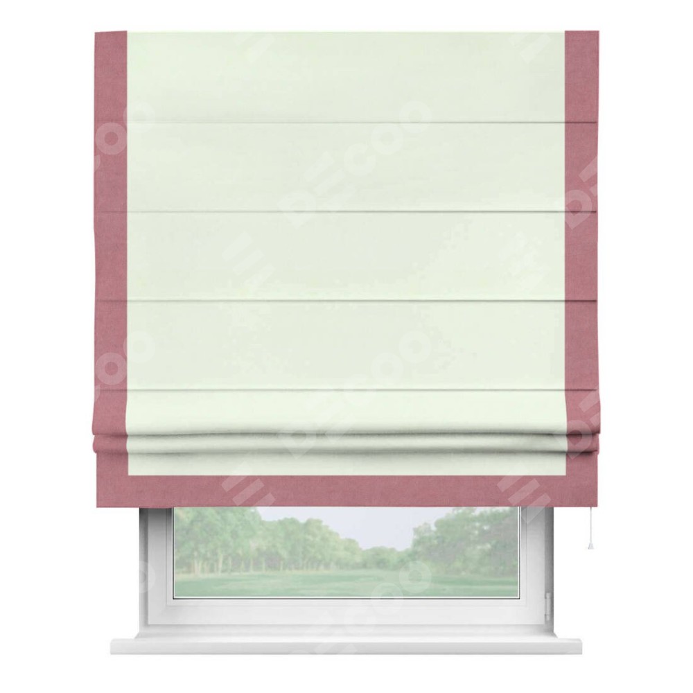 Римская штора производителя «Cortin», используется для проёма, пошита из ткани вельвет кремовый, артикул ткани 85524. Отделка шторы кантом «Виктория», ткань для канта используется из вельвета разной расцветки на выбор. Имеет универсальный механизм и подходит для монтажа: на потолок, на стену и в нишу.