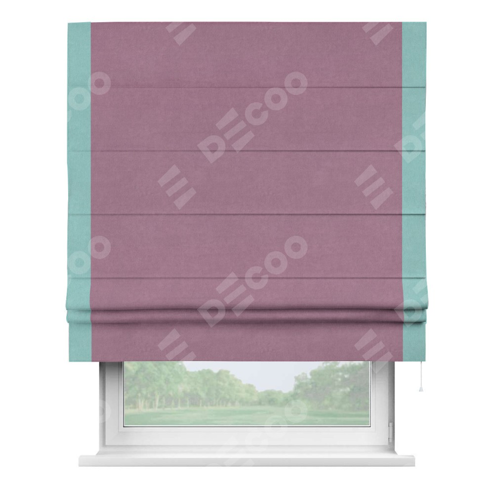 Римская штора производителя «Cortin», используется для проёма, пошита из ткани вельвет лиловый, артикул ткани 17752. Отделка шторы кантом «Стрим Дуо», ткань для канта используется из вельвета разной расцветки на выбор. Имеет универсальный механизм и подходит для монтажа: на потолок, на стену и в нишу.