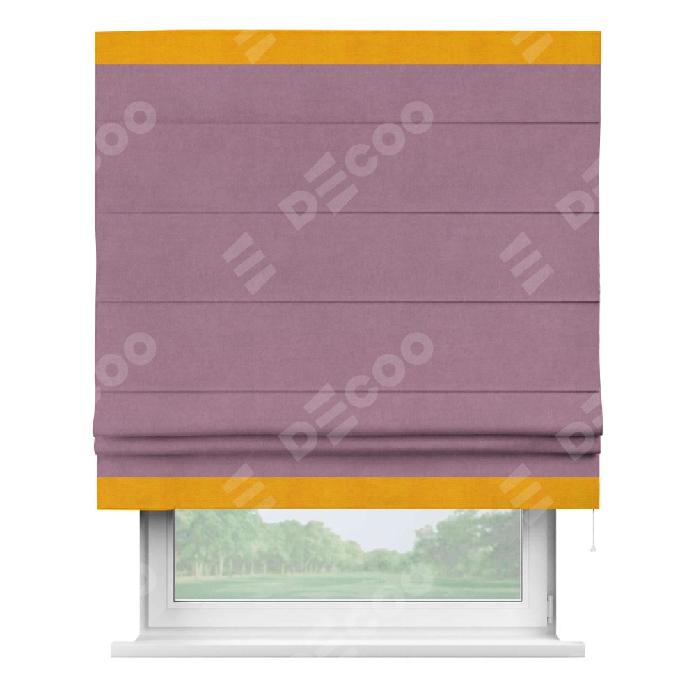 Римская штора производителя «Cortin», используется для проёма, пошита из ткани вельвет лиловый, артикул ткани 17752. Отделка шторы кантом «Горизонт», ткань для канта используется из вельвета разной расцветки на выбор. Имеет универсальный механизм и подходит для монтажа: на потолок, на стену и в нишу.
