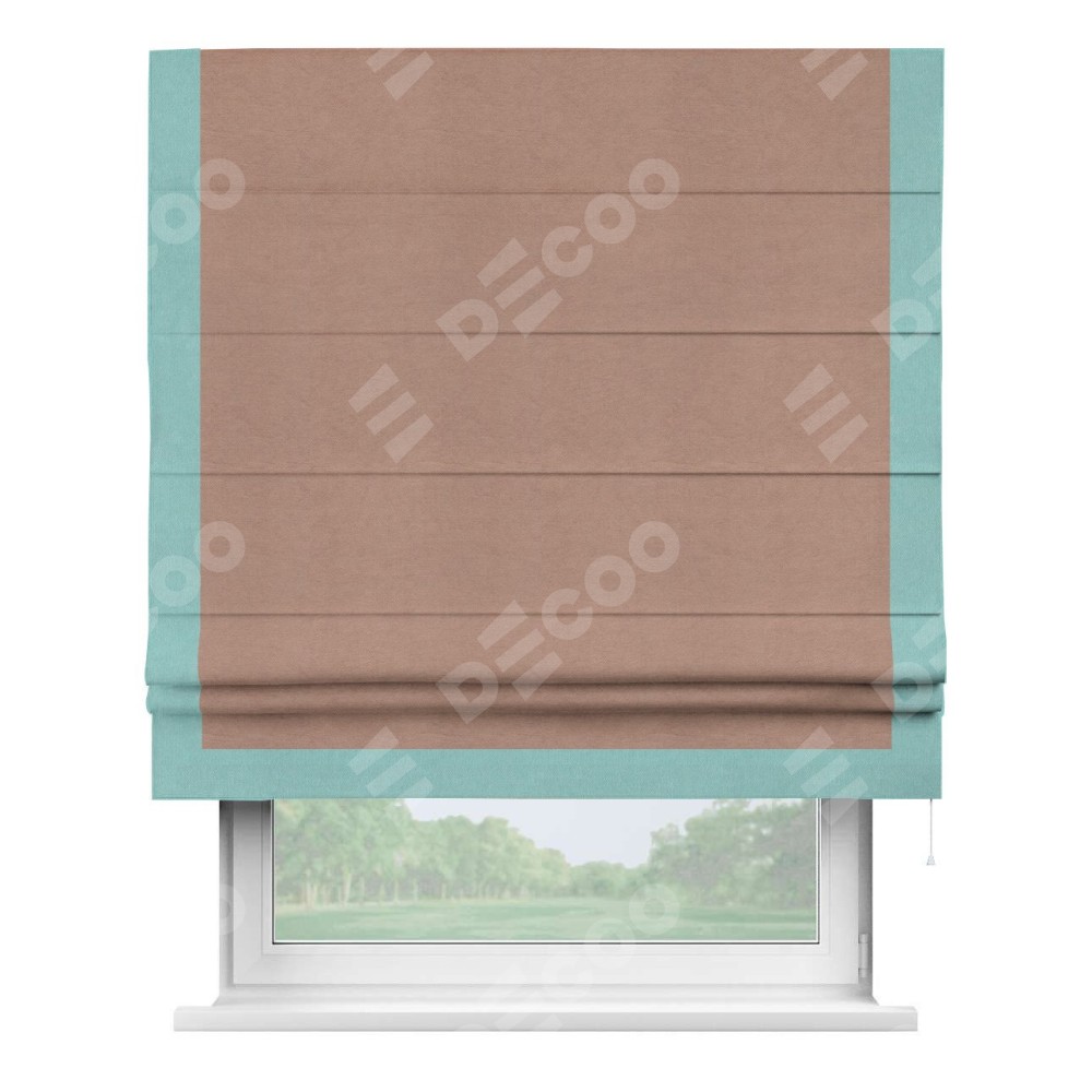 Римская штора производителя «Cortin», используется для проёма, пошита из ткани вельвет брусничный джем, артикул ткани 17750. Отделка шторы кантом «Виктория», ткань для канта используется из вельвета разной расцветки на выбор. Имеет универсальный механизм и подходит для монтажа: на потолок, на стену и в нишу.