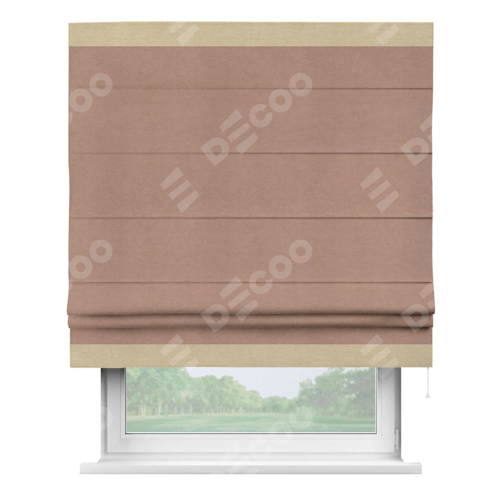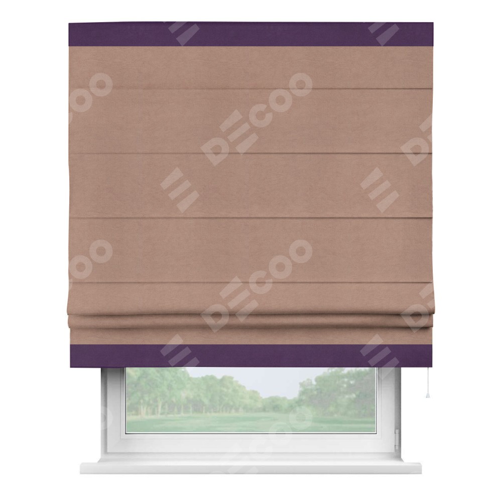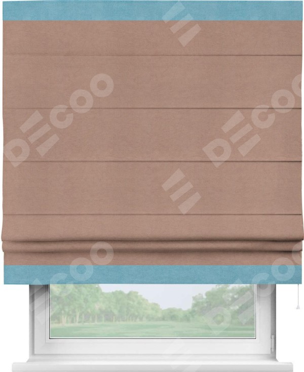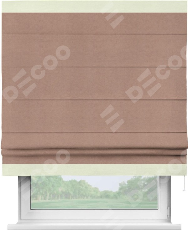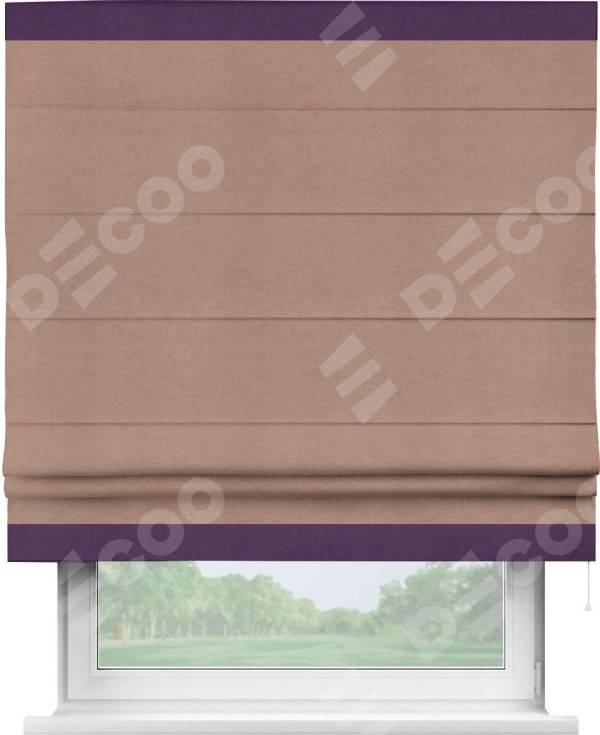 Римская штора производителя «Cortin», используется для проёма, пошита из ткани вельвет брусничный джем, артикул ткани 17750. Отделка шторы кантом «Горизонт», ткань для канта используется из вельвета разной расцветки на выбор. Имеет универсальный механизм и подходит для монтажа: на потолок, на стену и в нишу.
