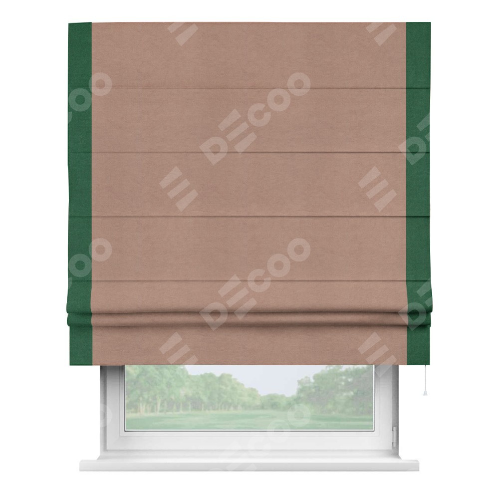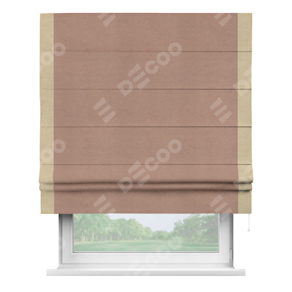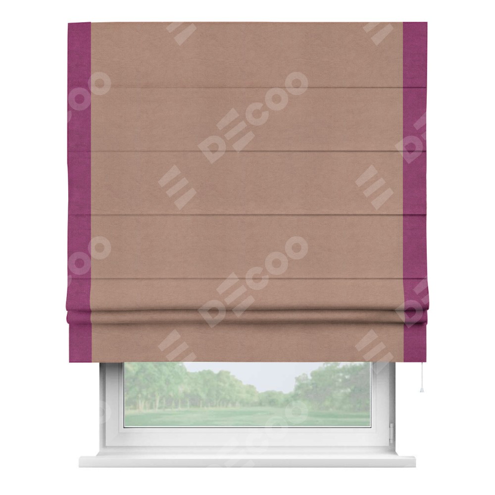 Римская штора производителя «Cortin», используется для проёма, пошита из ткани вельвет брусничный джем, артикул ткани 17750. Отделка шторы кантом «Стрим Дуо», ткань для канта используется из вельвета разной расцветки на выбор. Имеет универсальный механизм и подходит для монтажа: на потолок, на стену и в нишу.