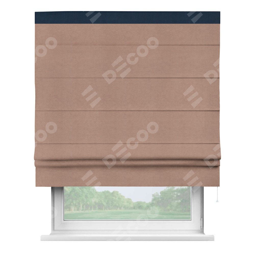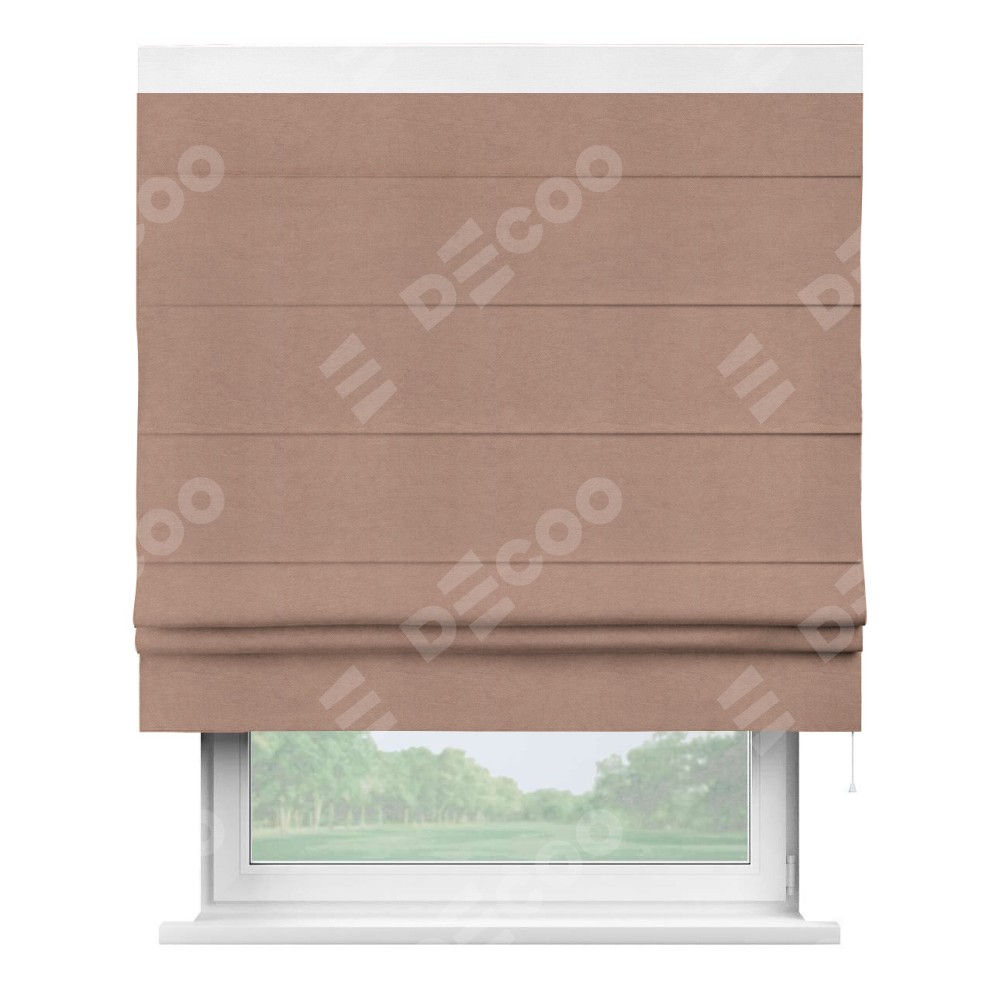 Римская штора производителя «Cortin», используется для проёма, пошита из ткани вельвет брусничный джем, артикул ткани 17750. Отделка шторы кантом «Кинг», ткань для канта используется из вельвета разной расцветки на выбор. Имеет универсальный механизм и подходит для монтажа: на потолок, на стену и в нишу.