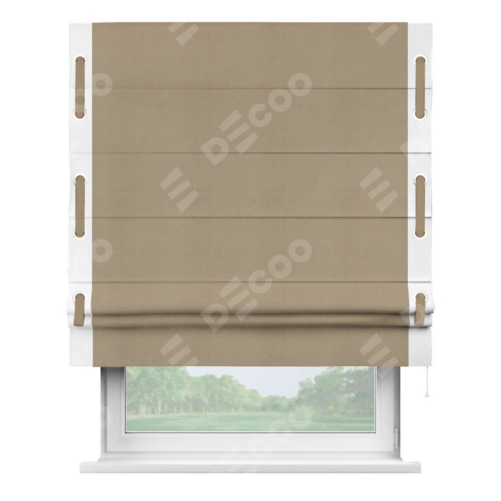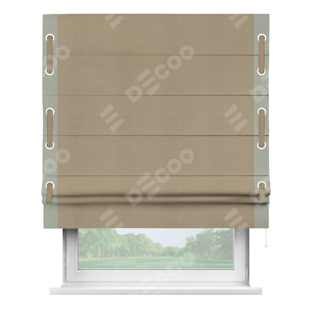 Римская штора производителя «Cortin», используется для проёма, пошита из ткани вельвет кофейный, артикул ткани 30980. Отделка шторы кантом «Стрим Дуо» на кантах расположены люверсы с пояском, ткань для канта используется из вельвета разной расцветки на выбор. Ткань для пояска обычно используется из основной ткани шторы, а так же можно сделать из любой расцветки по желанию. Имеет универсальный механизм и подходит для монтажа: на потолок, на стену и в нишу.