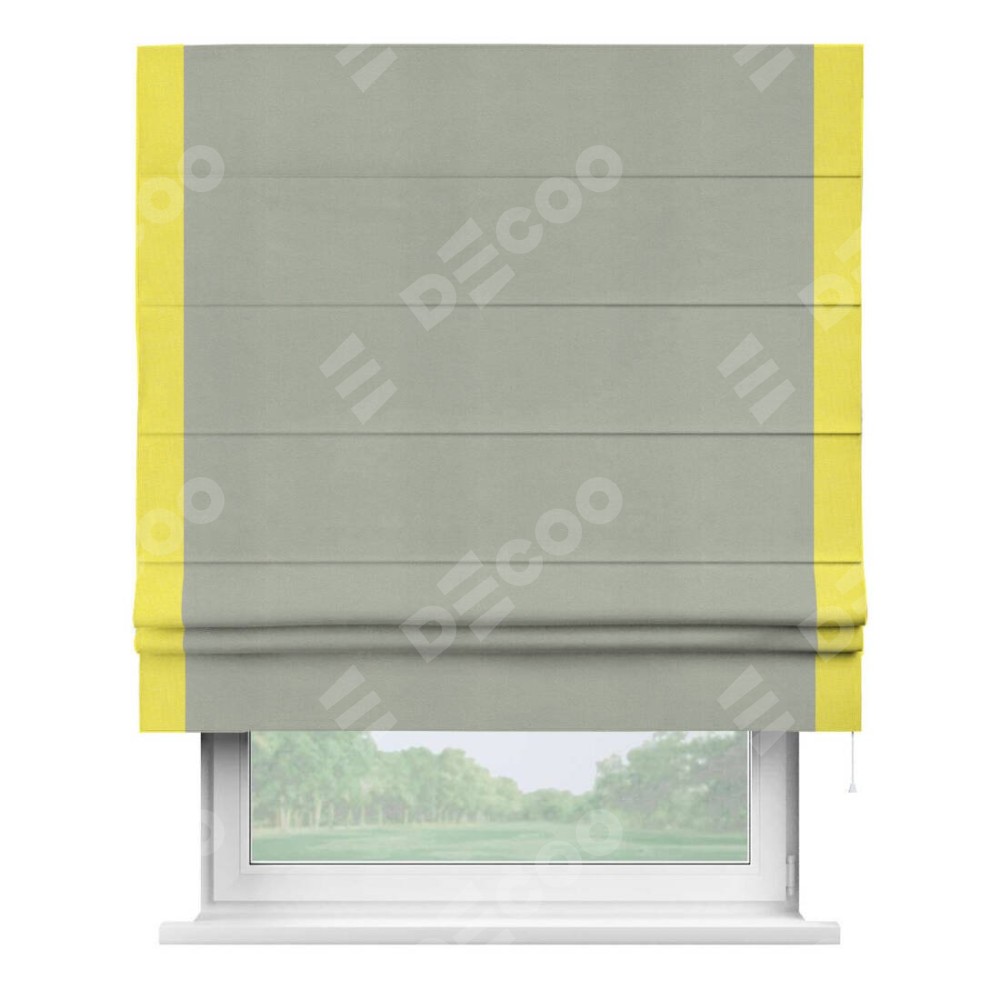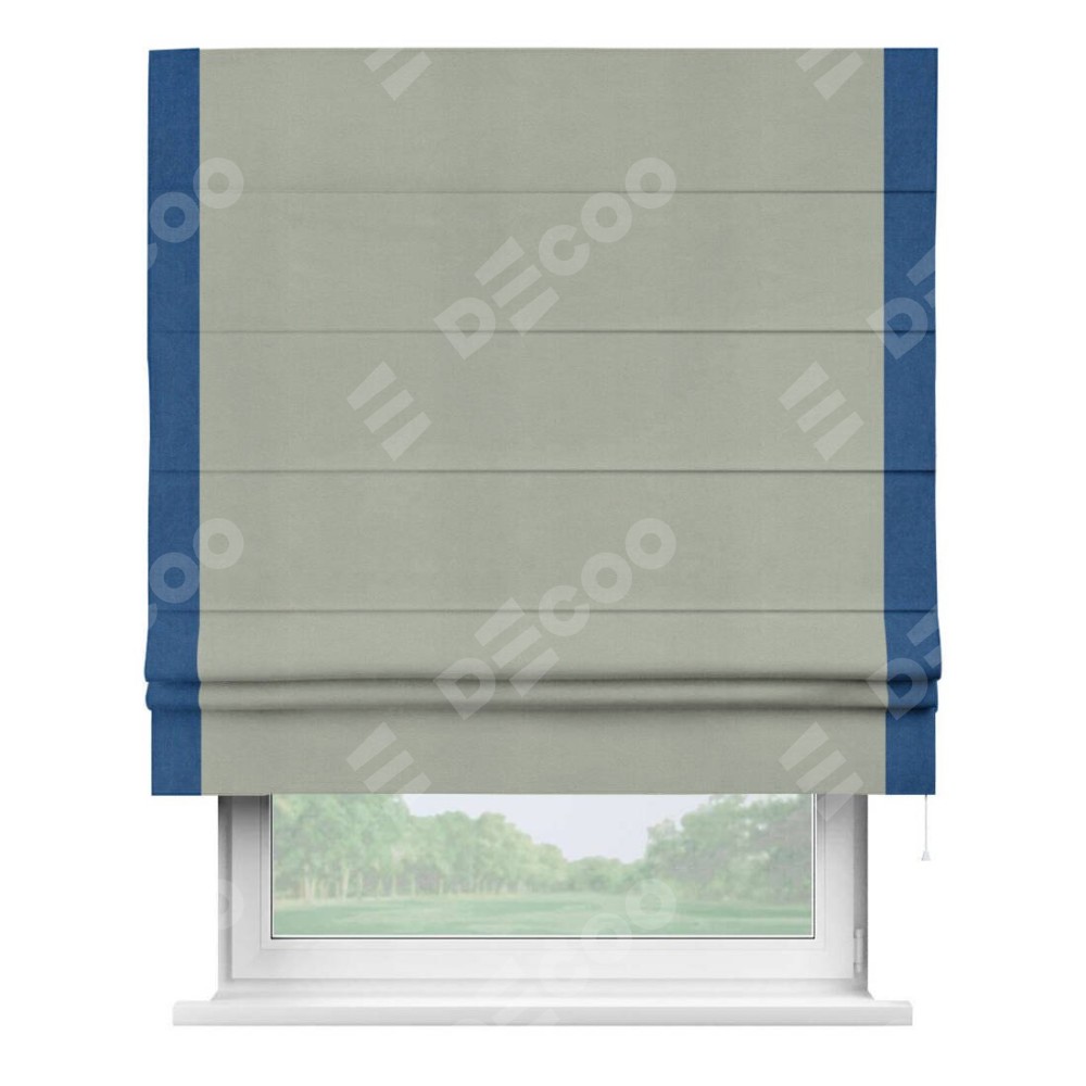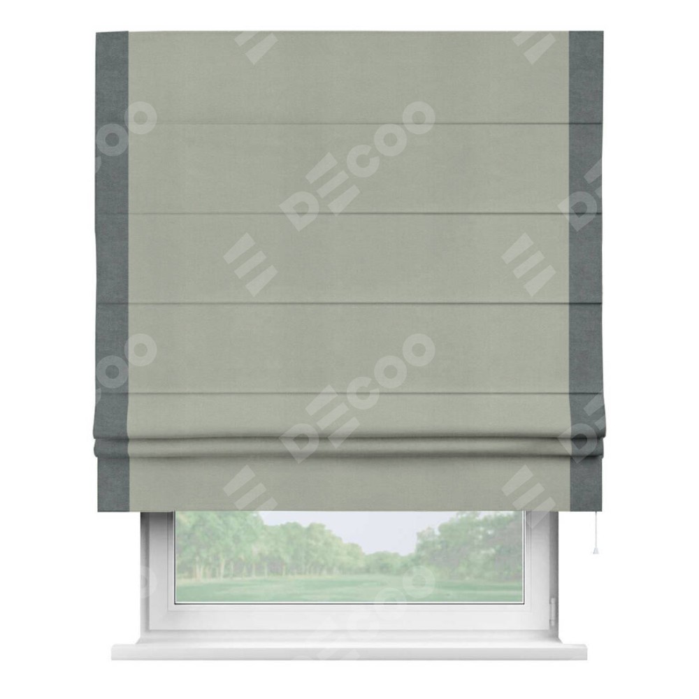 Римская штора производителя «Cortin», используется для проёма, пошита из ткани вельвет cветло-серый, артикул ткани 30981. Отделка шторы кантом «Стрим Дуо», ткань для канта используется из вельвета разной расцветки на выбор. Имеет универсальный механизм и подходит для монтажа: на потолок, на стену и в нишу.