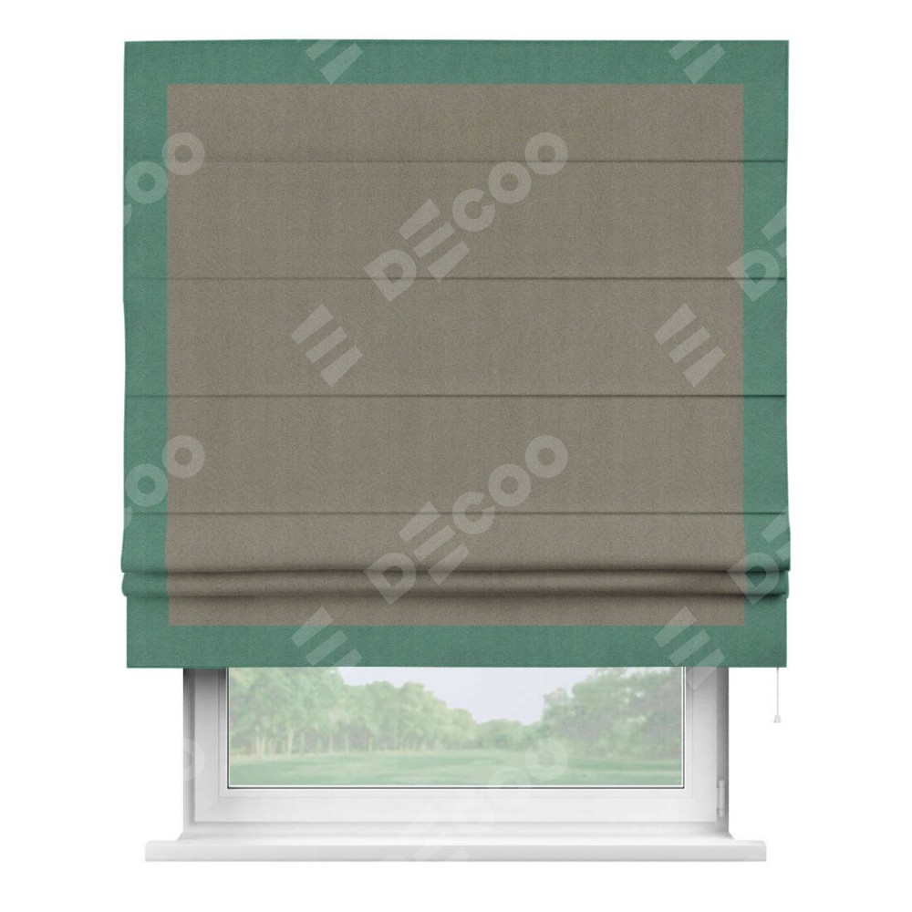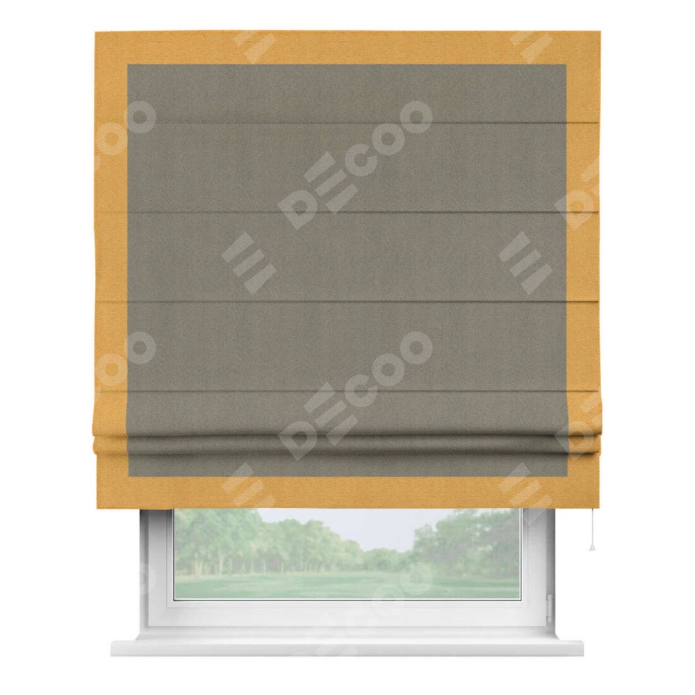 Римская штора производителя «Cortin», используется для проёма, пошита из ткани блэкаут с блеском графитовый, артикул 34648. Отделка шторы кантом «Чесс», ткань для канта используется из блэкаута с блеском разной расцветки на выбор. Изнаночная сторона материала черного цвета, что обеспечивает необходимую светонепроницаемость. Имеет универсальный механизм и подходит для монтажа: на потолок, на стену и в нишу.