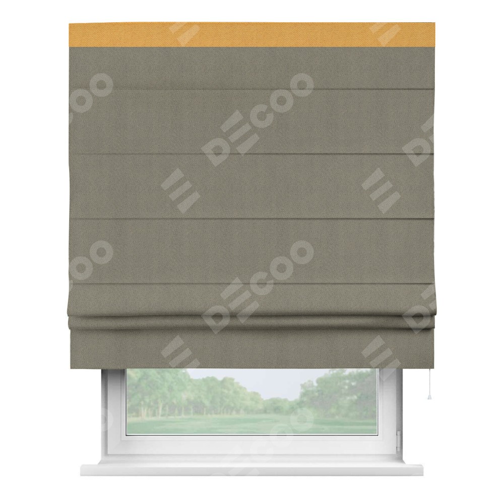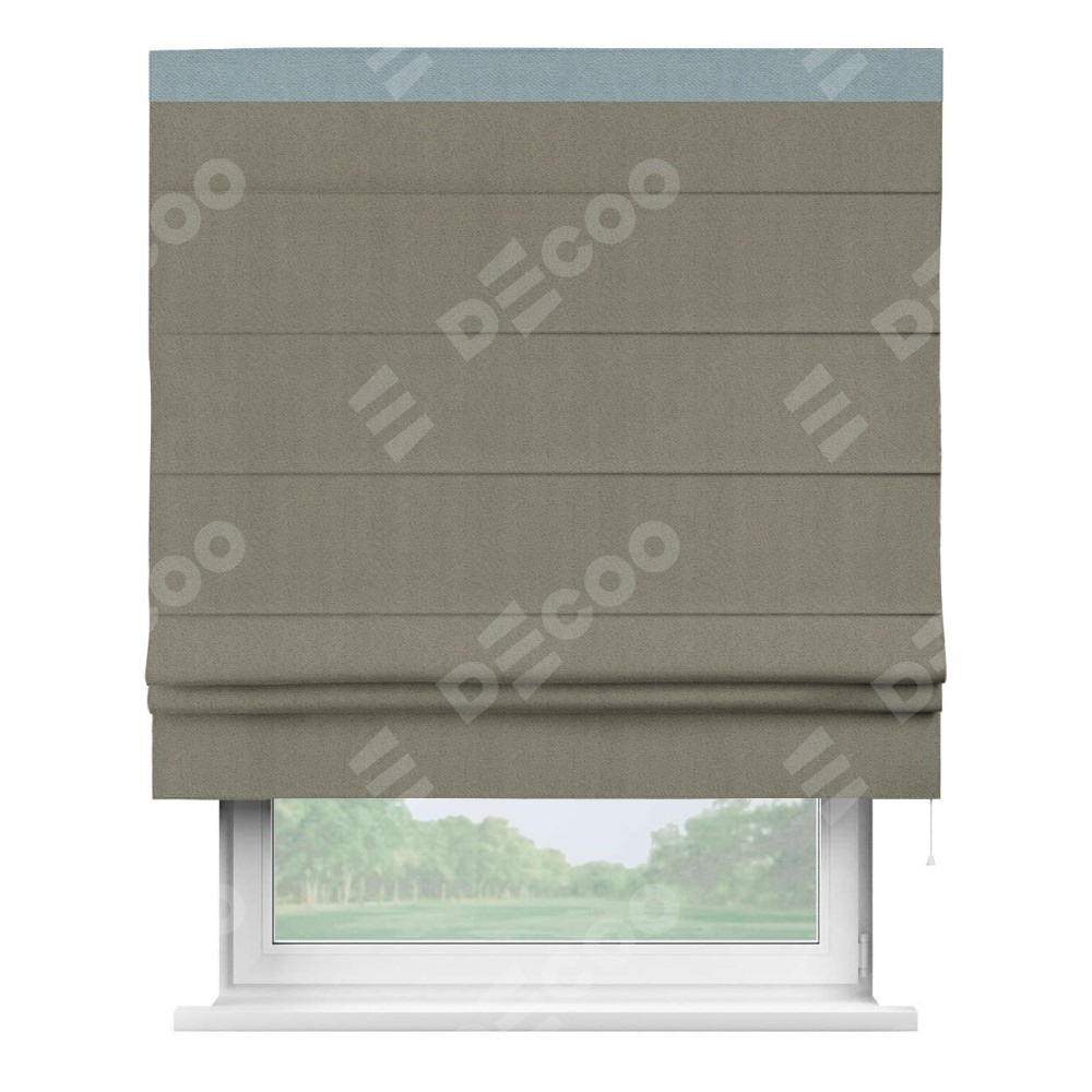 Римская штора производителя «Cortin», используется для проёма, пошита из ткани блэкаут с блеском графитовый, артикул 34648. Отделка шторы кантом «Кинг», ткань для канта используется из блэкаута с блеском разной расцветки на выбор. Изнаночная сторона материала черного цвета, что обеспечивает необходимую светонепроницаемость. Имеет универсальный механизм и подходит для монтажа: на потолок, на стену и в нишу.
