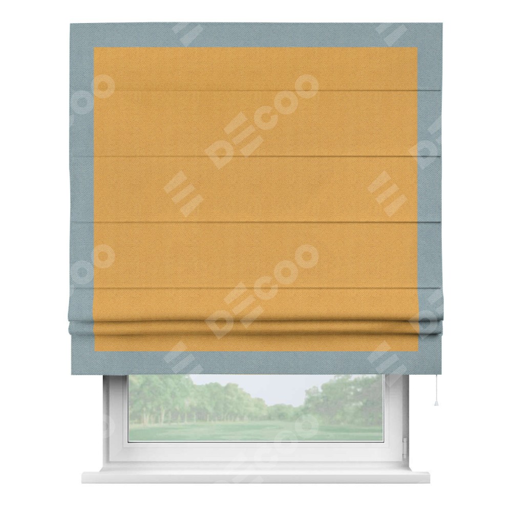 Римская штора производителя «Cortin», используется для проёма, пошита из ткани блэкаут с блеском золотой, артикул 34626. Отделка шторы кантом «Чесс», ткань для канта используется из блэкаута с блеском разной расцветки на выбор. Изнаночная сторона материала черного цвета, что обеспечивает необходимую светонепроницаемость. Имеет универсальный механизм и подходит для монтажа: на потолок, на стену и в нишу.