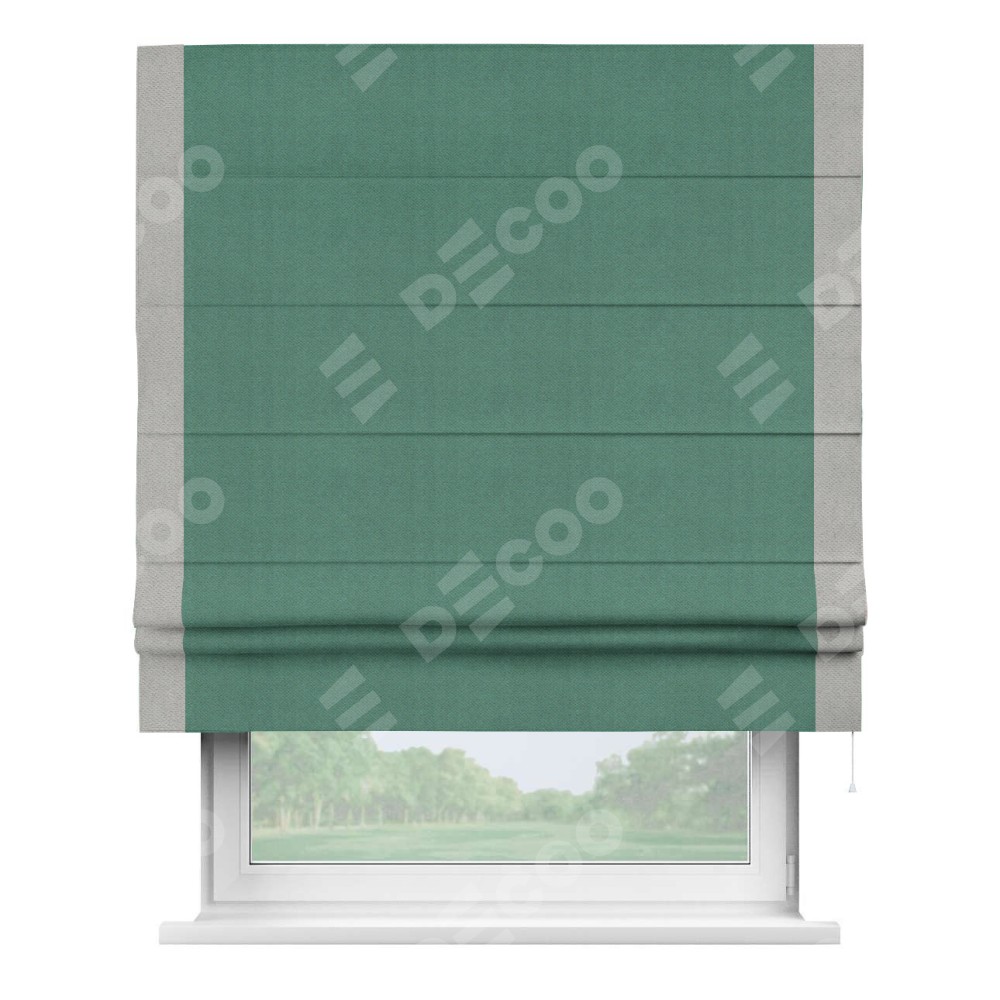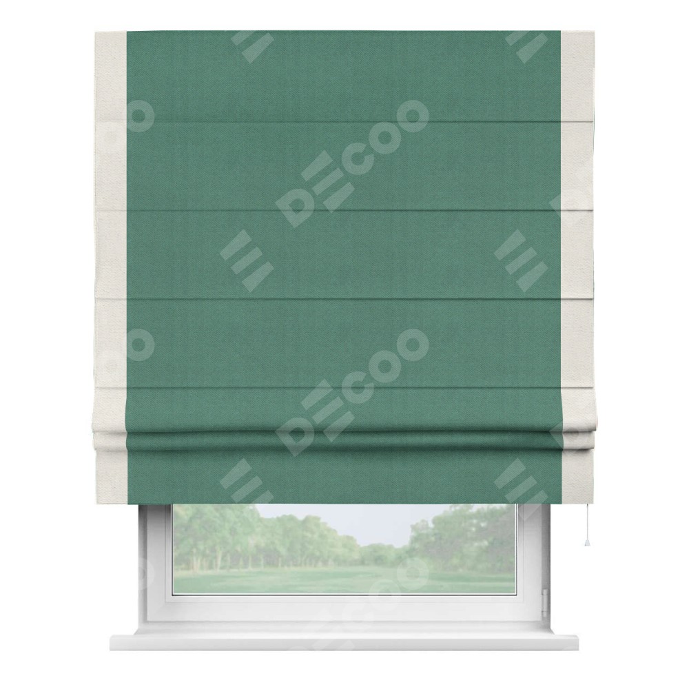 Римская штора производителя «Cortin», используется для проёма, пошита из ткани блэкаут с блеском изумрудный, артикул 34628. Отделка шторы кантом «Стрим Дуо», ткань для канта используется из блэкаута с блеском разной расцветки на выбор. Изнаночная сторона материала черного цвета, что обеспечивает необходимую светонепроницаемость. Имеет универсальный механизм и подходит для монтажа: на потолок, на стену и в нишу.