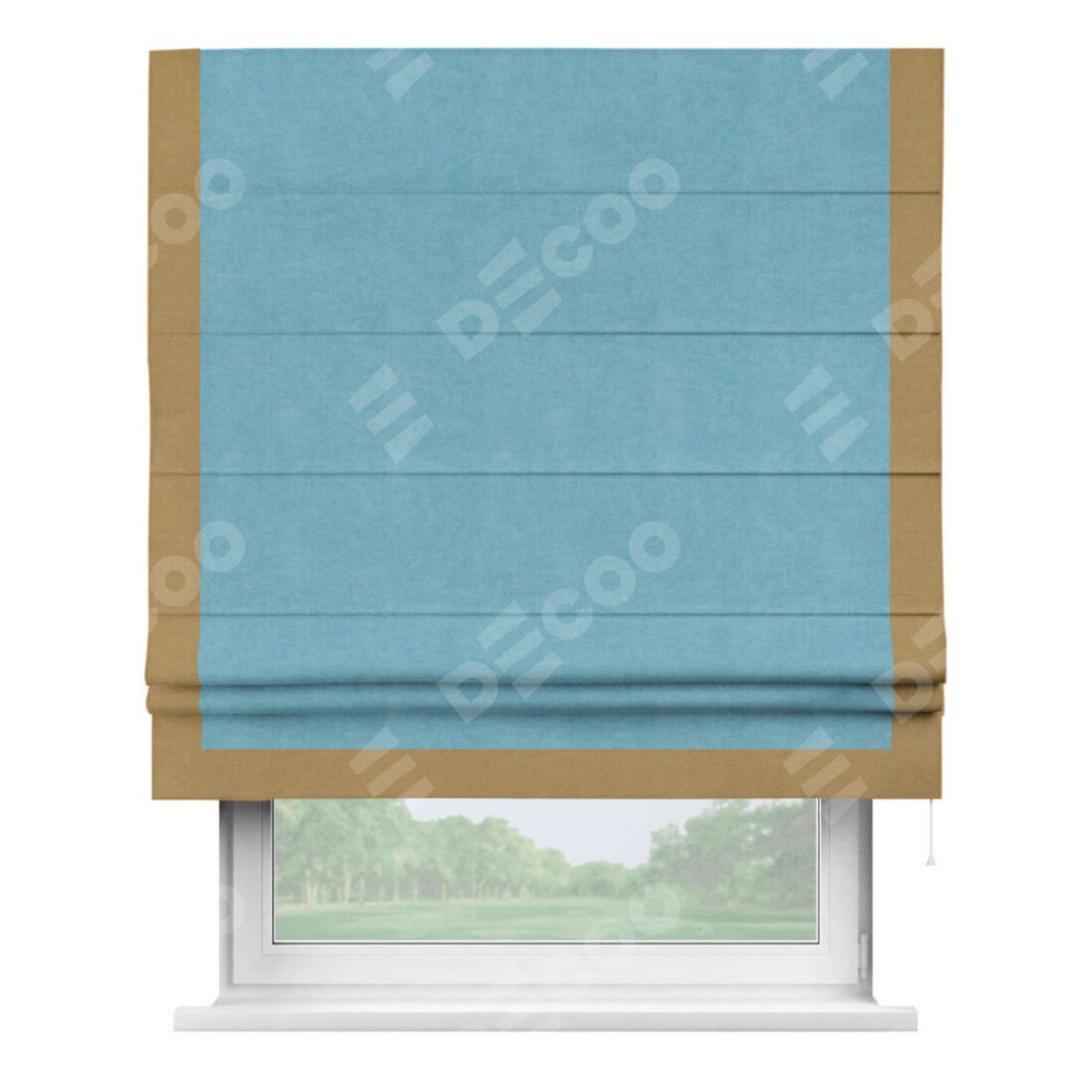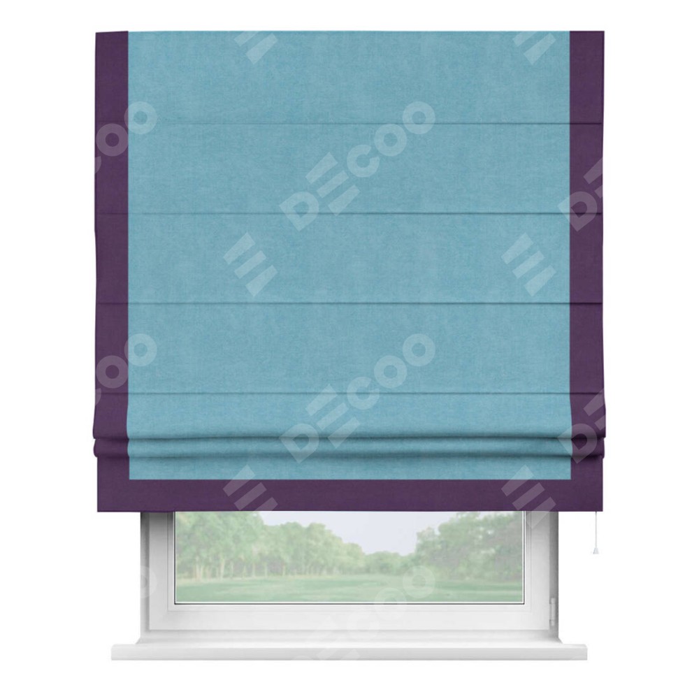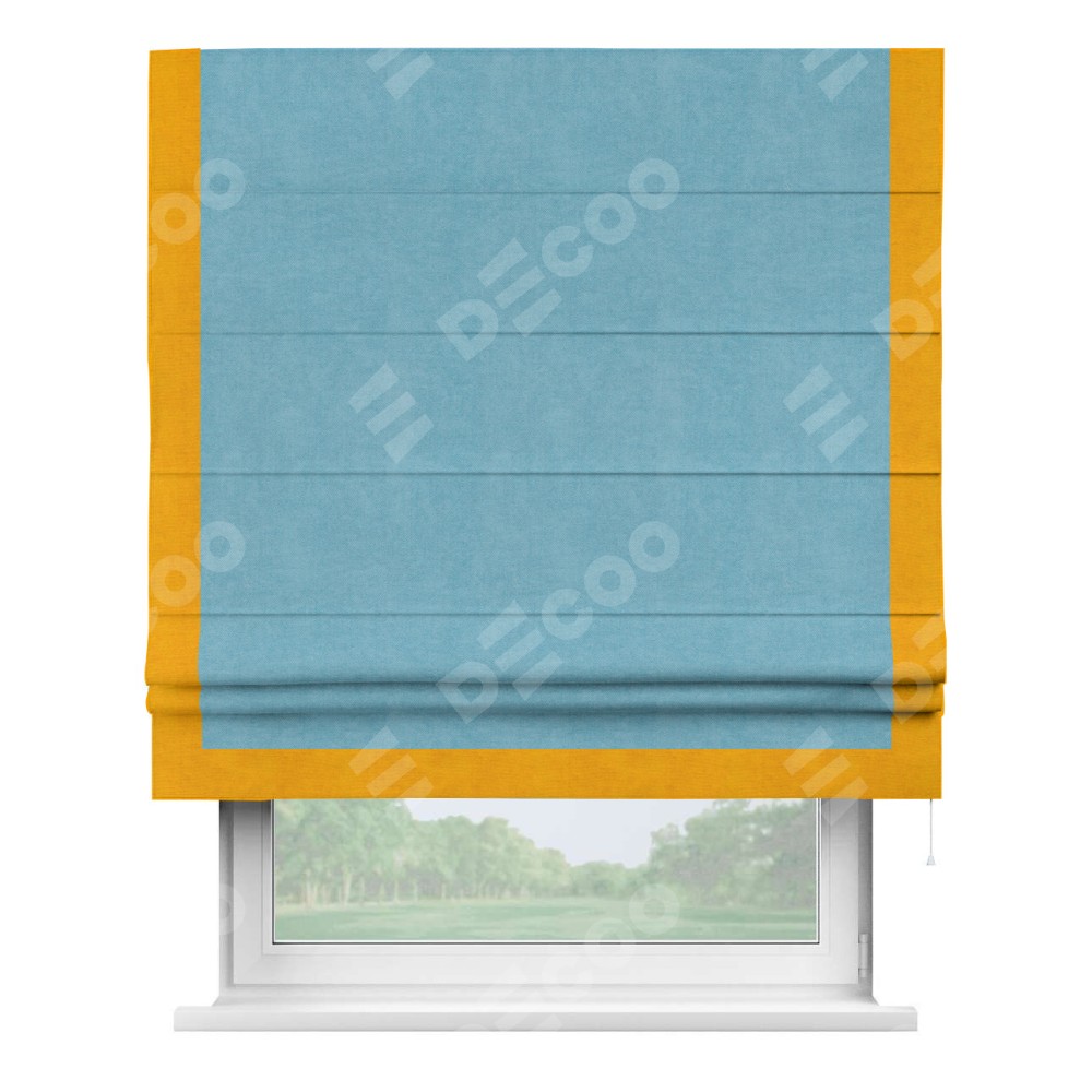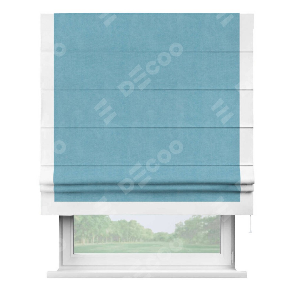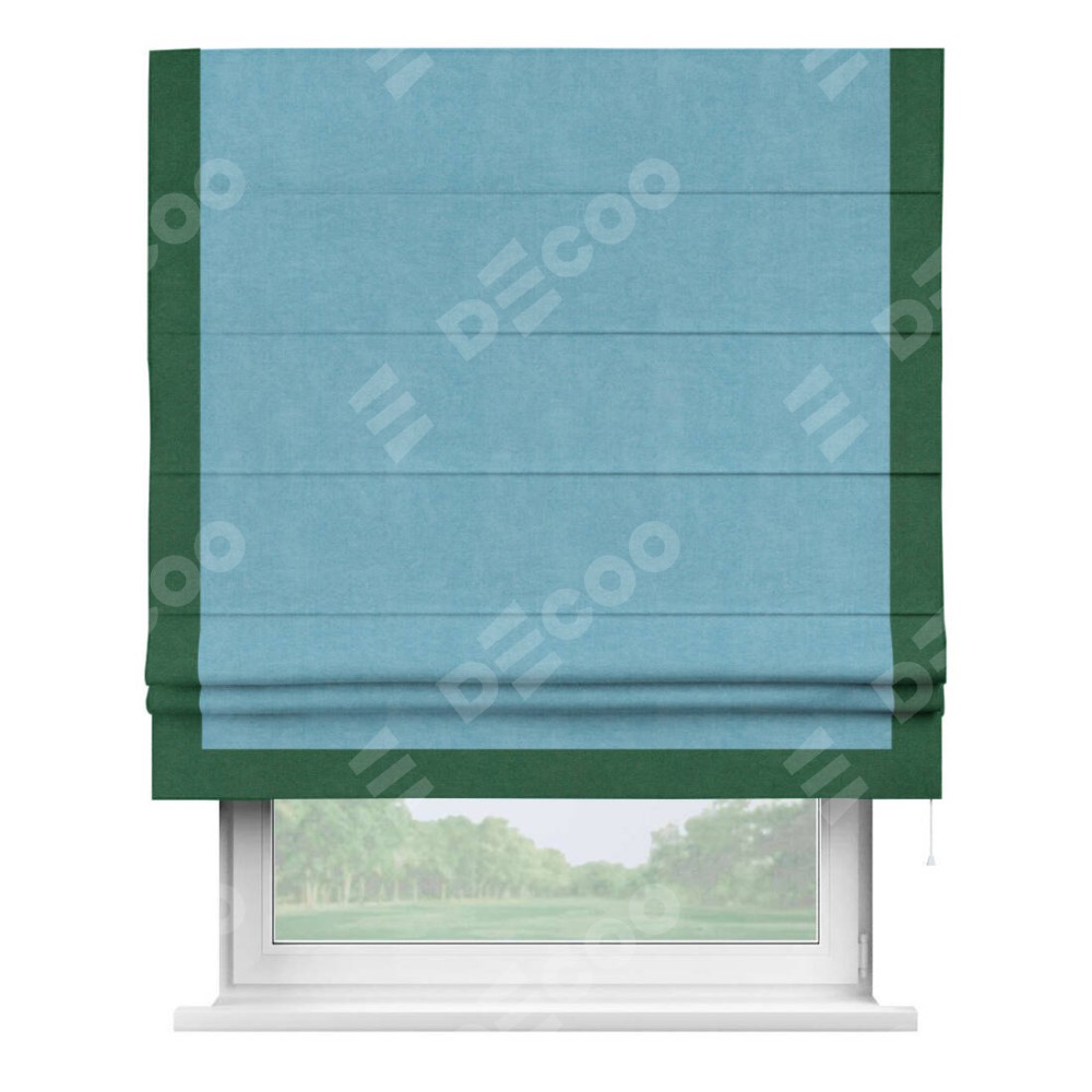 Римская штора производителя «Cortin», используется для проёма, пошита из ткани вельвет ментоловый, артикул ткани 10443. Отделка шторы кантом «Виктория», ткань для канта используется из вельвета разной расцветки на выбор. Имеет универсальный механизм и подходит для монтажа: на потолок, на стену и в нишу.
