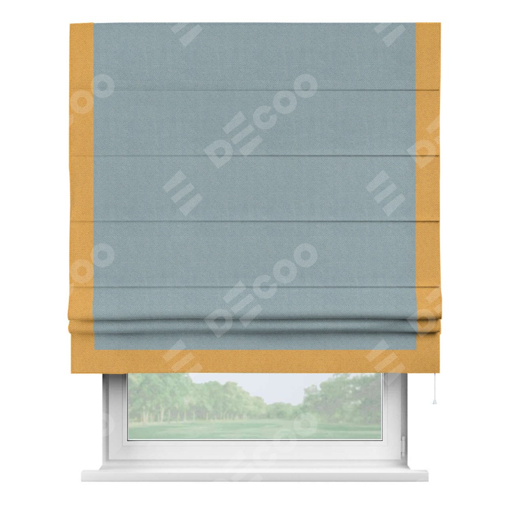 Римская штора производителя «Cortin», используется для проёма, пошита из ткани блэкаут с блеском синий, артикул 34625. Отделка шторы кантом «Виктория», ткань для канта используется из блэкаута с блеском разной расцветки на выбор. Изнаночная сторона материала черного цвета, что обеспечивает необходимую светонепроницаемость. Имеет универсальный механизм и подходит для монтажа: на потолок, на стену и в нишу.