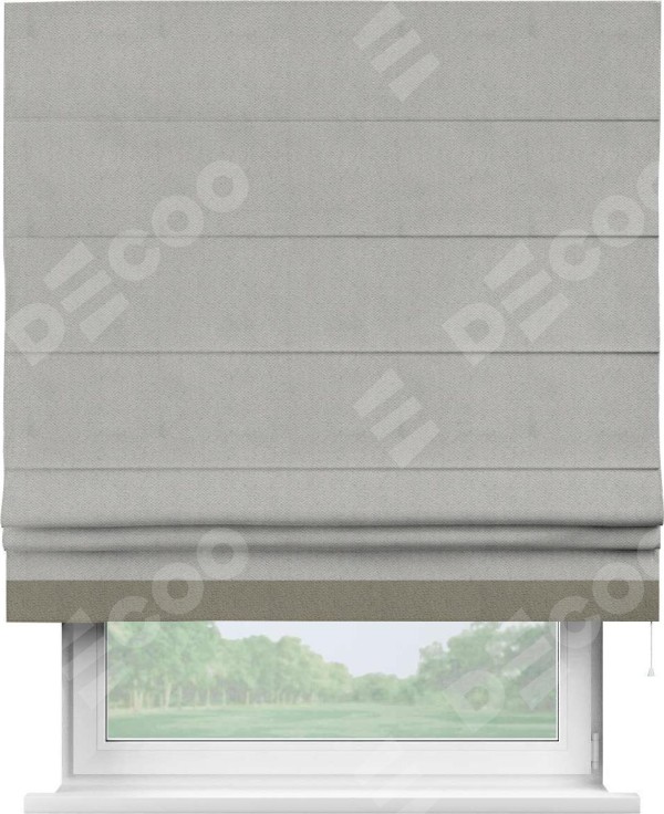 Римская штора производителя «Cortin», используется для проёма, пошита из ткани блэкаут с блеском тёмно-серый, артикул 34634. Отделка шторы кантом «Джестер», ткань для канта используется из блэкаута с блеском разной расцветки на выбор. Изнаночная сторона материала черного цвета, что обеспечивает необходимую светонепроницаемость. Имеет универсальный механизм и подходит для монтажа: на потолок, на стену и в нишу.