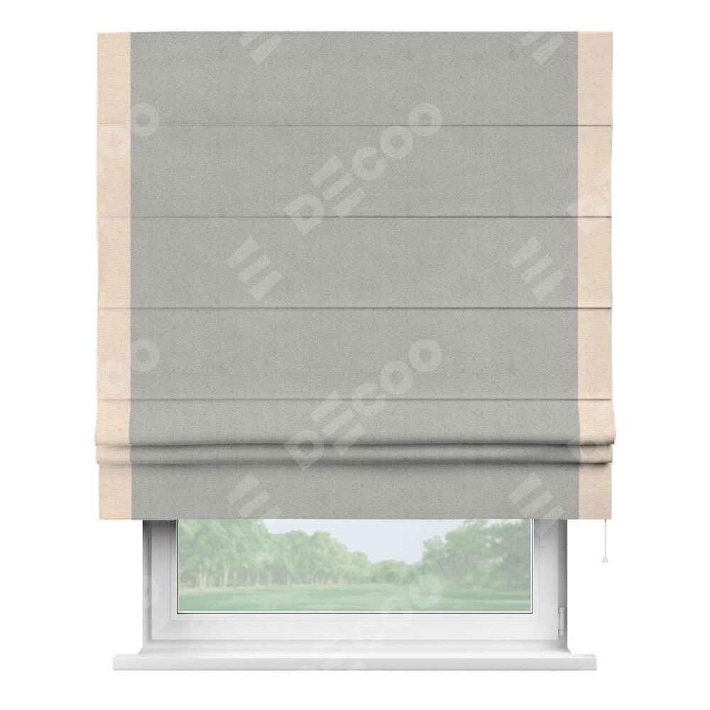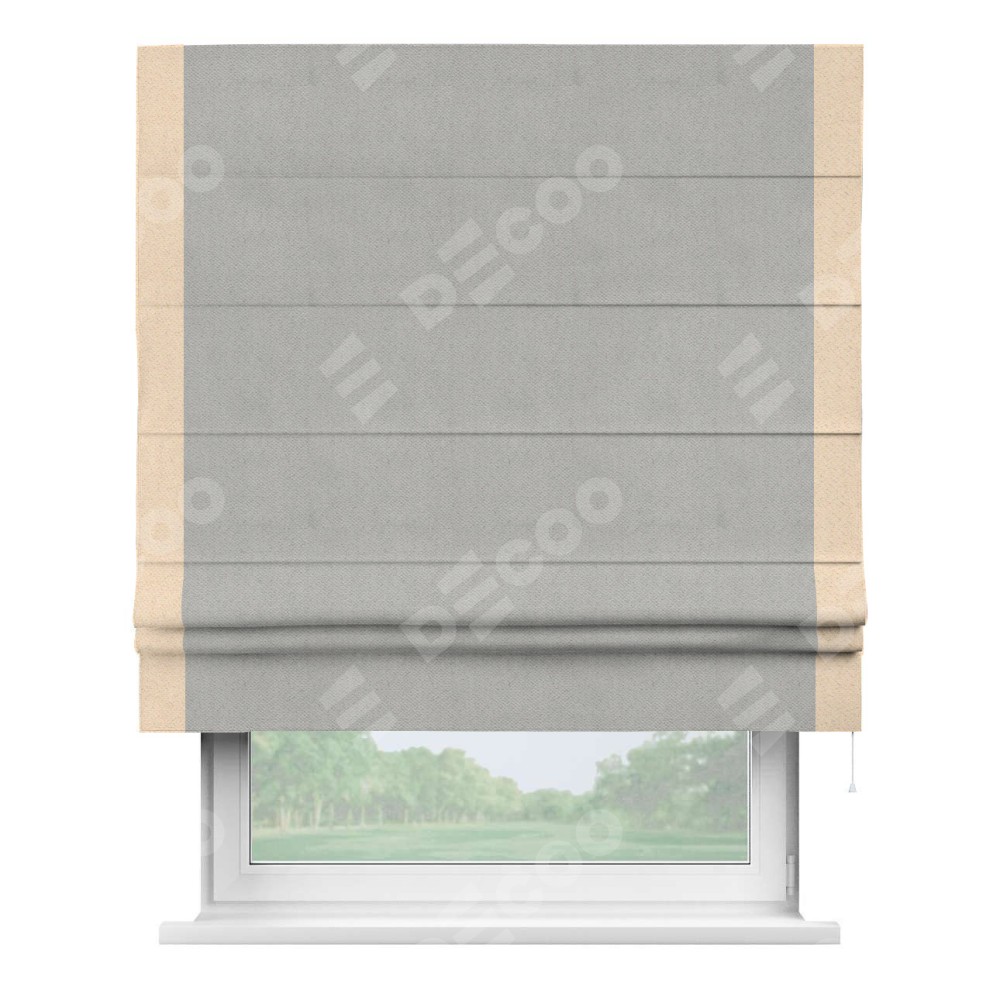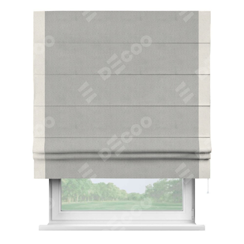 Римская штора производителя «Cortin», используется для проёма, пошита из ткани блэкаут с блеском тёмно-серый, артикул 34634. Отделка шторы кантом «Стрим Дуо», ткань для канта используется из блэкаута с блеском разной расцветки на выбор. Изнаночная сторона материала черного цвета, что обеспечивает необходимую светонепроницаемость. Имеет универсальный механизм и подходит для монтажа: на потолок, на стену и в нишу.