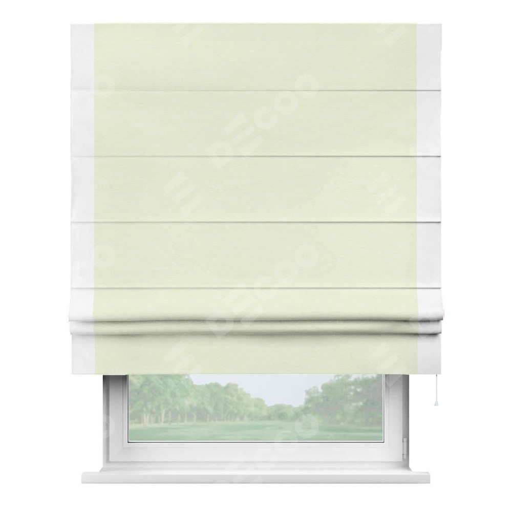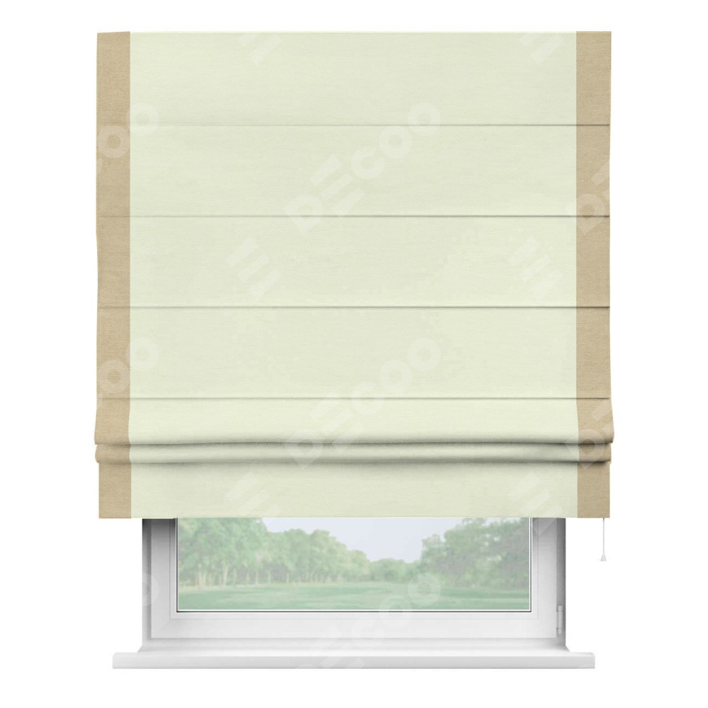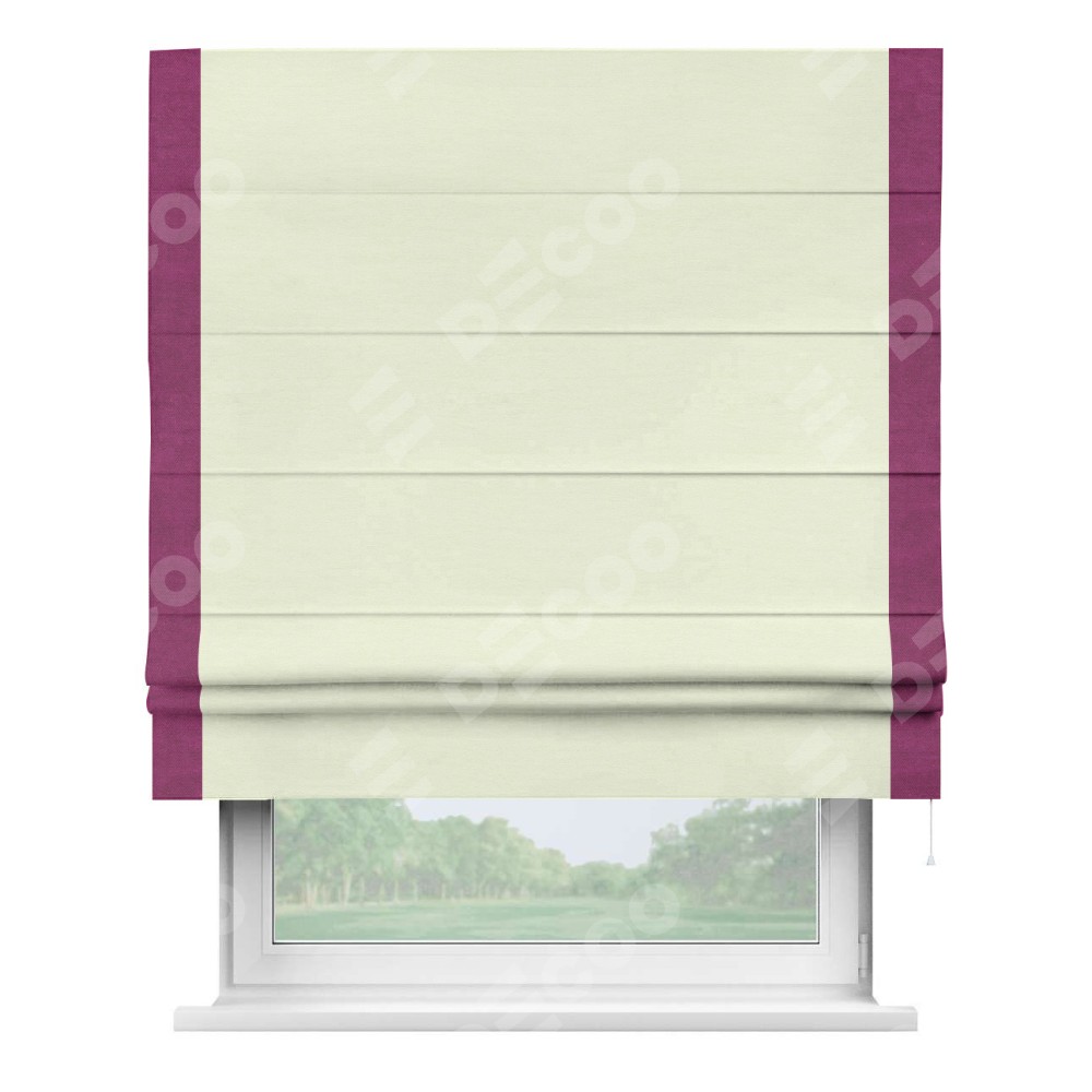 Римская штора производителя «Cortin», используется для проёма, пошита из ткани вельвет молочный, артикул ткани 85536. Отделка шторы кантом «Стрим Дуо», ткань для канта используется из вельвета разной расцветки на выбор. Имеет универсальный механизм и подходит для монтажа: на потолок, на стену и в нишу.