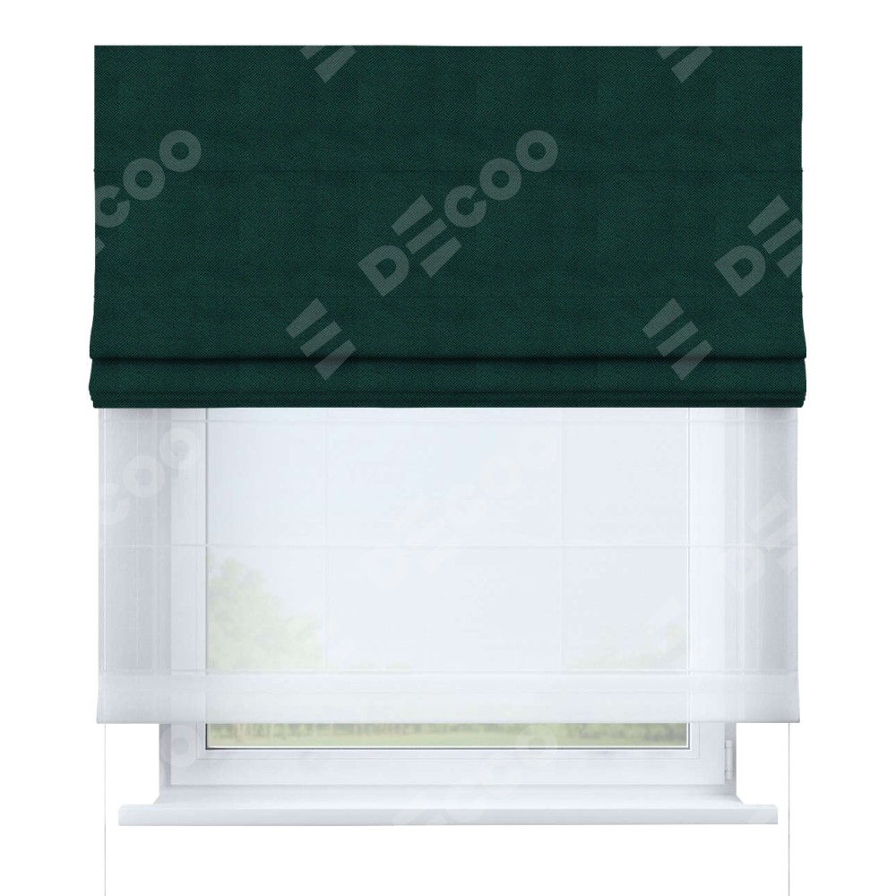 Римская штора день-ночь производителя «Cortin», используется для проёма, пошита из двух полотен, с лицевой стороны cotton блэкаут изумруд артикул 35311, вторая ткань тюль (по стандарту комплектуется тюль белого цвета артикул V-01). Имеет универсальный механизм и подходит для монтажа: на потолок, на стену и в нишу.