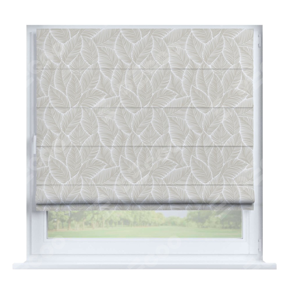Римская штора производителя «Cortin», устанавливается на створку окна, пошита из ткани блэкаут с нанесением сублимационной печати «Бежевые листья». Штора шьётся по индивидуальным размерам, для данного типа римской шторы возможная ширина от 35 до 150 см., высота до 250 см.