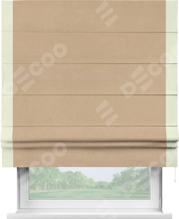 Римская штора производителя «Cortin», используется для проёма, пошита из ткани вельвет песочный, артикул ткани 17740. Отделка шторы кантом «Стрим Дуо», ткань для канта используется из вельвета разной расцветки на выбор. Имеет универсальный механизм и подходит для монтажа: на потолок, на стену и в нишу.
