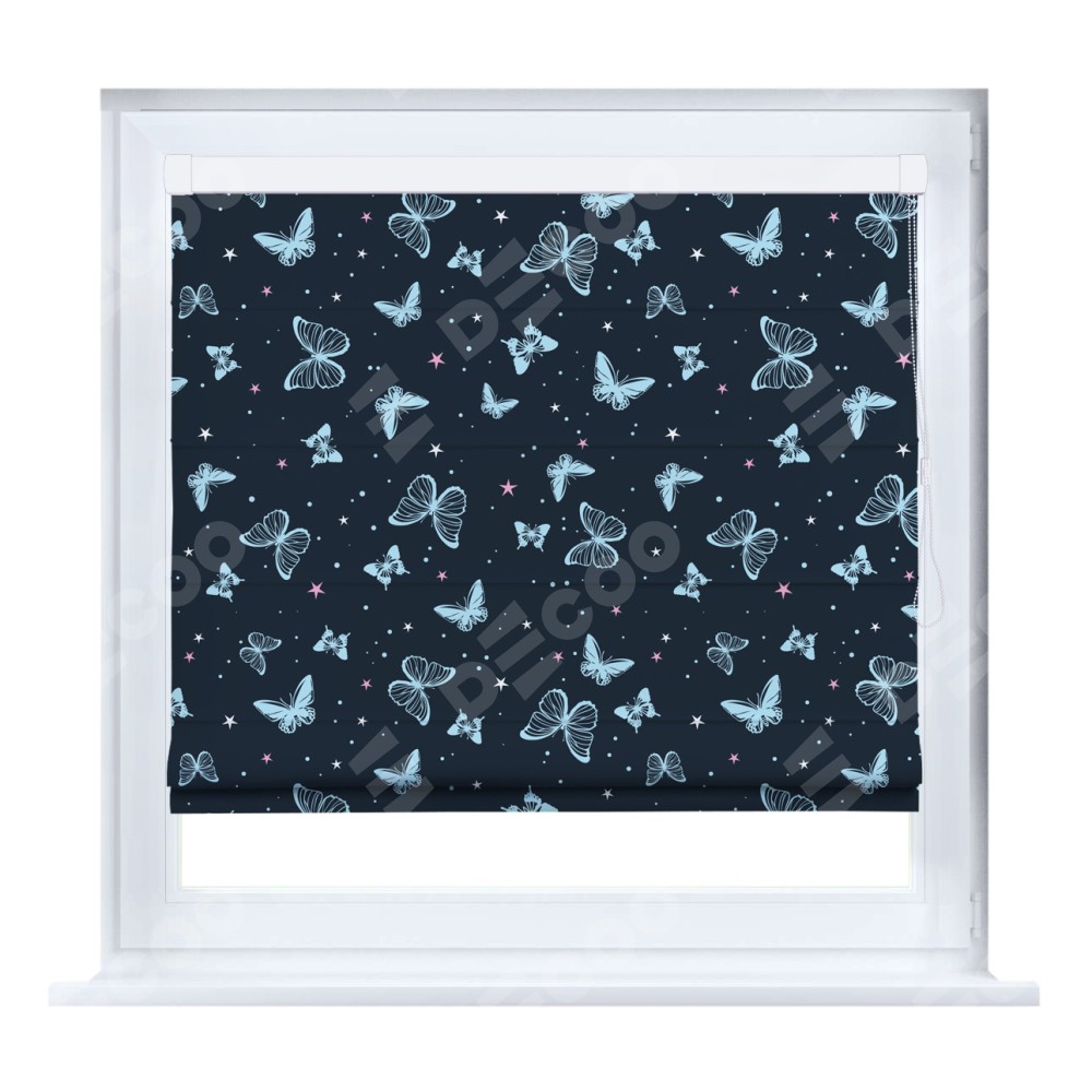 Римская штора производителя «Cortin», устанавливается на створку окна, пошита из ткани блэкаут с нанесением сублимационной печати «Неоновые бабочки». Штора шьётся по индивидуальным размерам, для данного типа римской шторы возможная ширина от 35 до 150 см., высота до 250 см.
