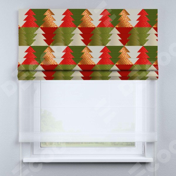 Римская штора день-ночь производителя «Cortin», используется для проёма, пошита из двух полотен, с лицевой блэкаут с нанесением сублимационной печати «Новогоднее украшение», вторая ткань тюль (по стандарту комплектуется тюль белого цвета артикул V-01). Имеет универсальный механизм и подходит для монтажа: на потолок, на стену и в нишу.