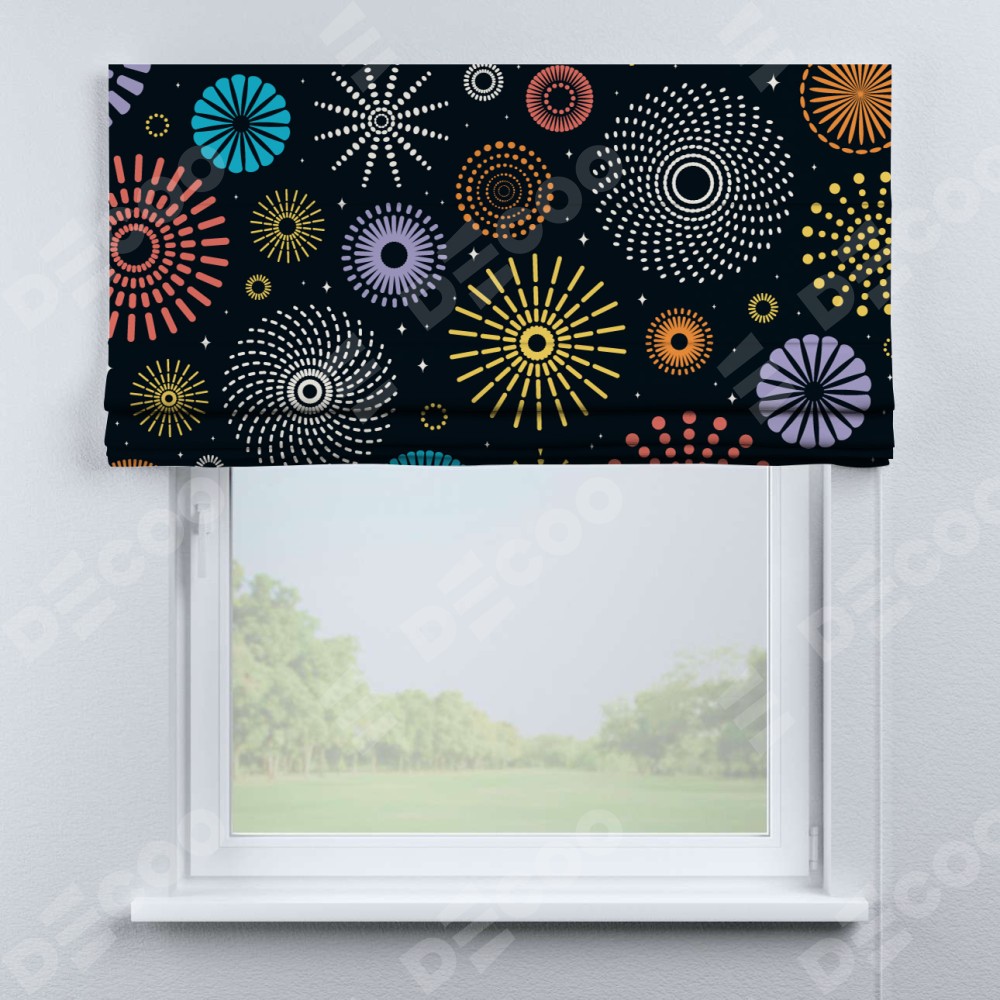 Римская штора производителя «Cortin», используется для проёма, пошита из ткани блэкаут с нанесением сублимационной печати «Праздничный фейерверк». Имеет универсальный механизм и подходит для монтажа: на потолок, на стену и в нишу.