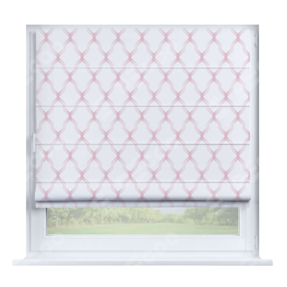 Римская штора производителя «Cortin», устанавливается на створку окна, пошита из ткани блэкаут с нанесением сублимационной печати «Розовые ромбы». Штора шьётся по индивидуальным размерам, для данного типа римской шторы возможная ширина от 35 до 150 см., высота до 250 см.