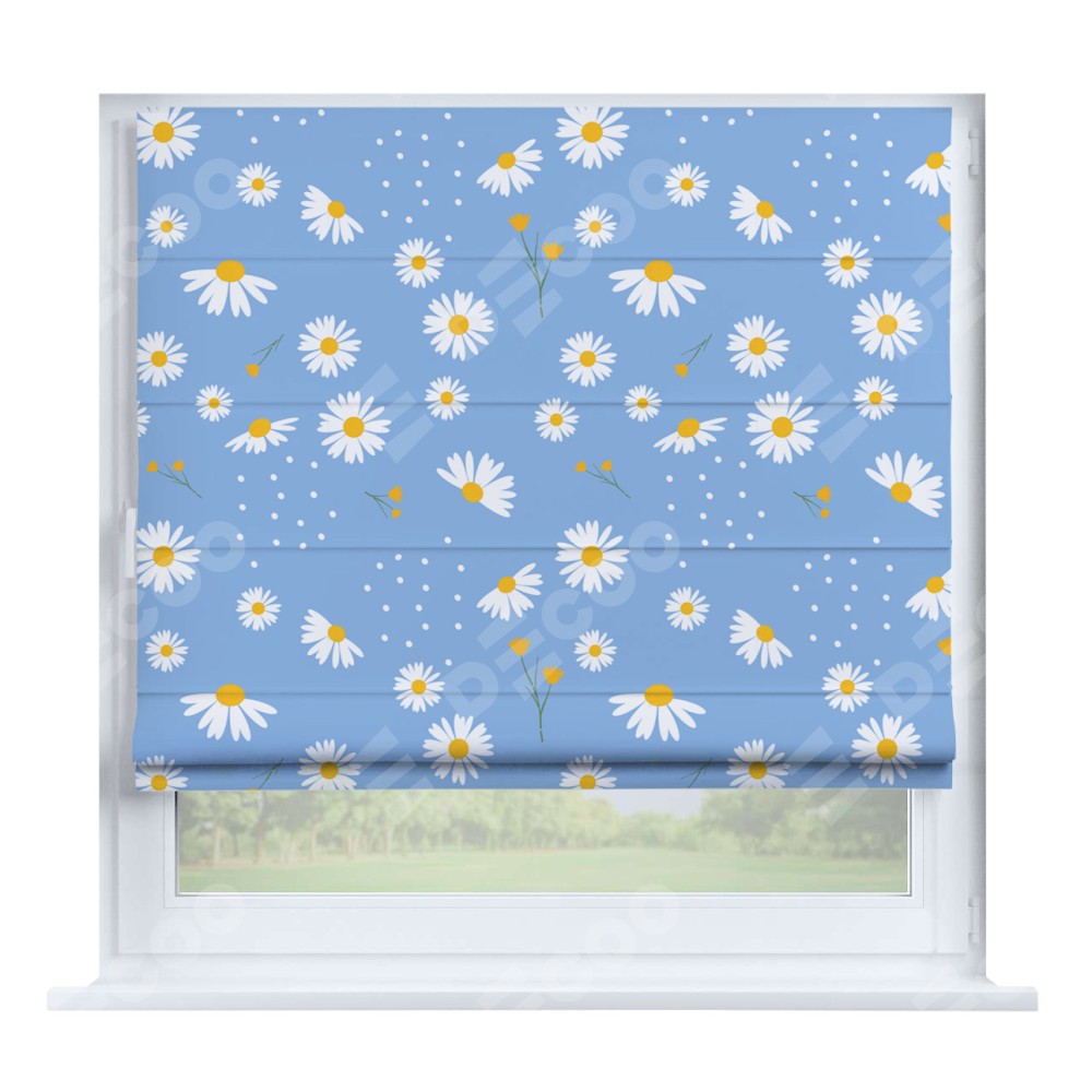 Римская штора производителя «Cortin», устанавливается на створку окна, пошита из ткани блэкаут с нанесением сублимационной печати «Ромашки на голубом». Штора шьётся по индивидуальным размерам, для данного типа римской шторы возможная ширина от 35 до 150 см., высота до 250 см.