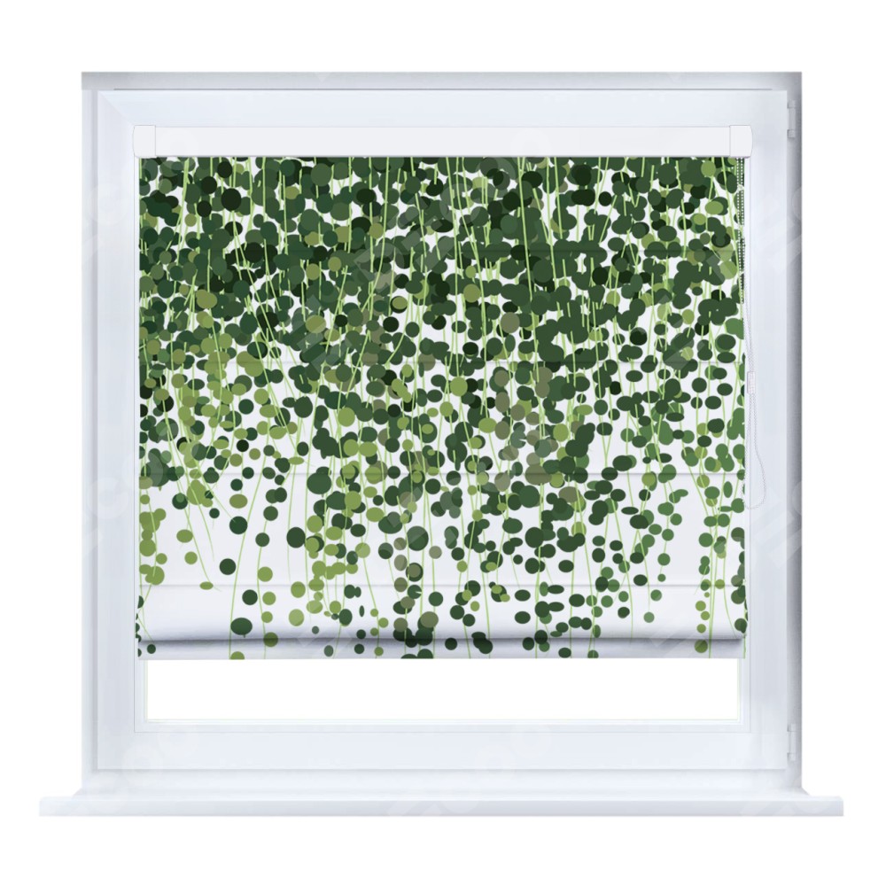 Римская штора производителя «Cortin», устанавливается на створку окна, пошита из ткани блэкаут с нанесением сублимационной печати «Зелёный занавес». Штора шьётся по индивидуальным размерам, для данного типа римской шторы возможная ширина от 35 до 150 см., высота до 250 см.
