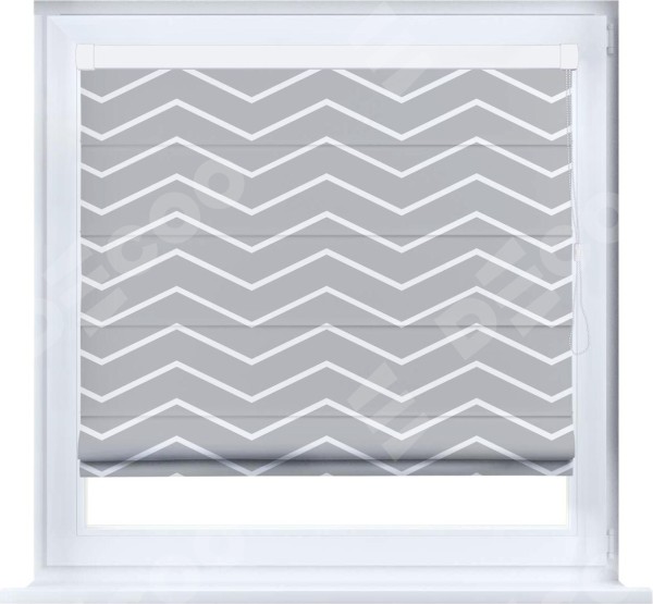 Римская штора производителя «Cortin», устанавливается на створку окна, пошита из ткани блэкаут с нанесением сублимационной печати «Серый зигзаг». Штора шьётся по индивидуальным размерам, для данного типа римской шторы возможная ширина от 35 до 150 см., высота до 250 см.