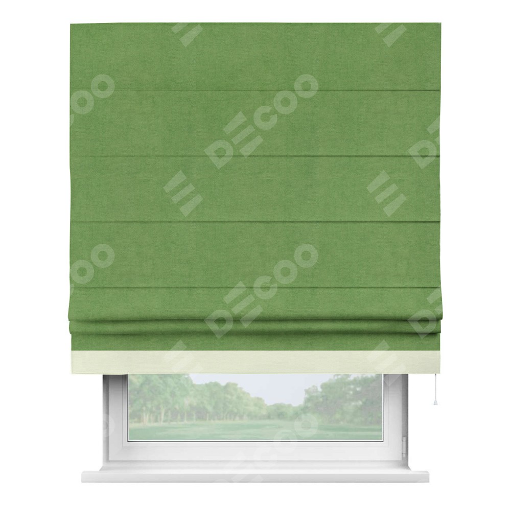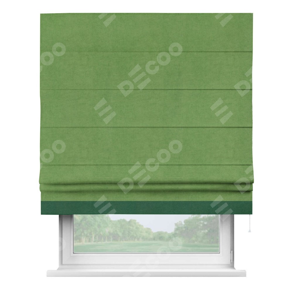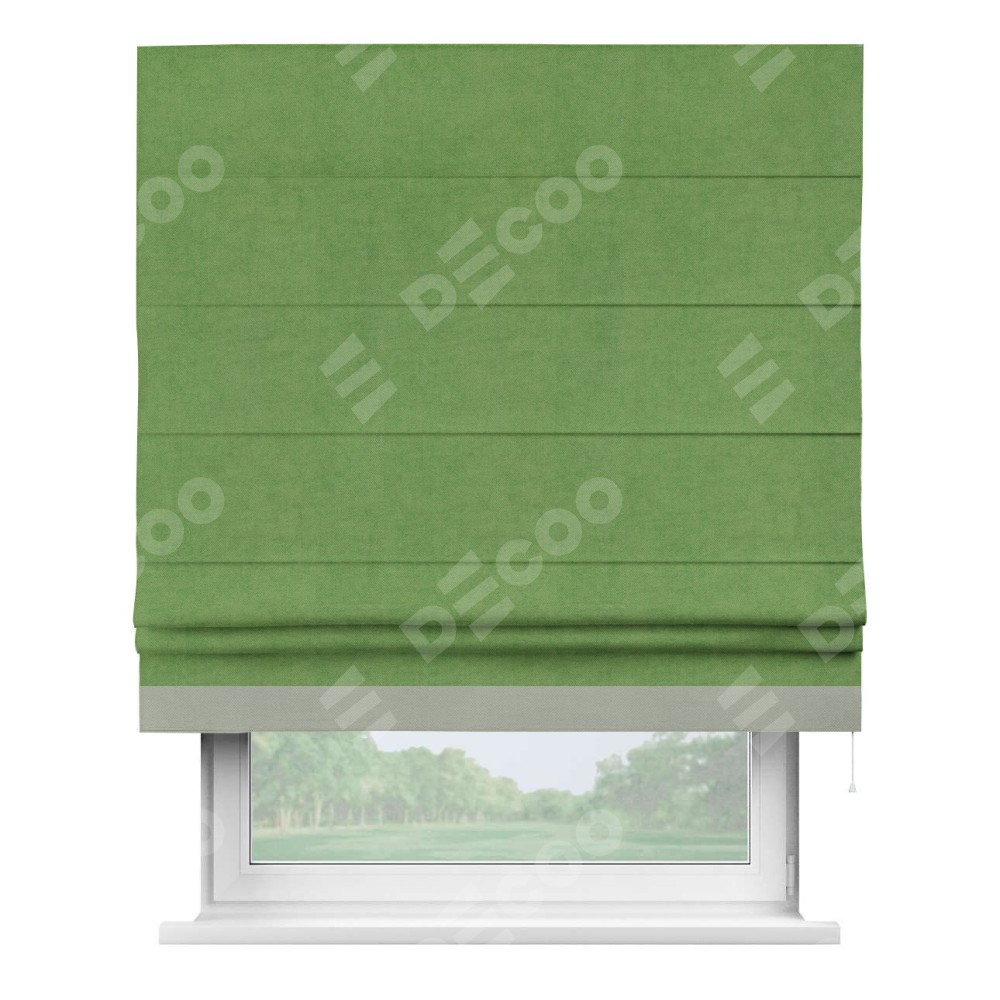 Римская штора производителя «Cortin», используется для проёма, пошита из ткани вельвет салатовый, артикул ткани 87072. Отделка шторы кантом «Джестер», ткань для канта используется из вельвета разной расцветки на выбор. Имеет универсальный механизм и подходит для монтажа: на потолок, на стену и в нишу.