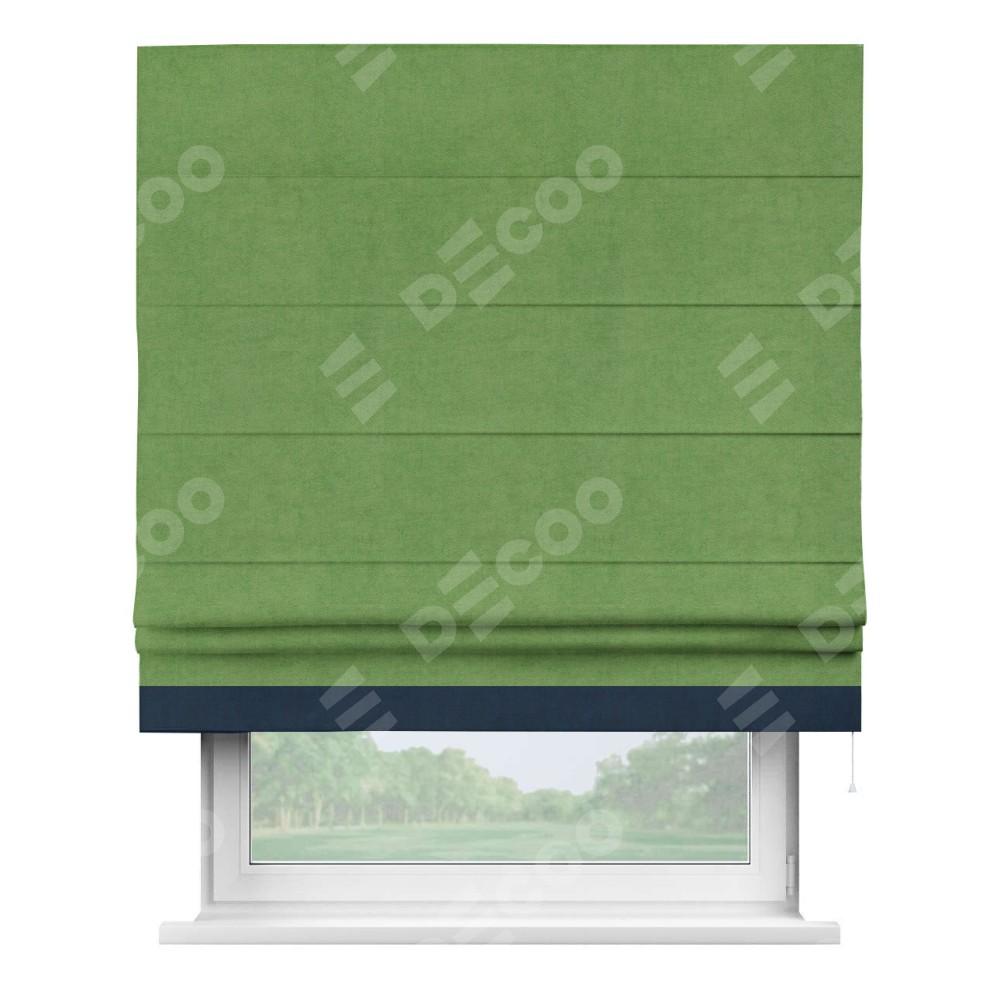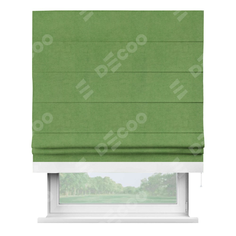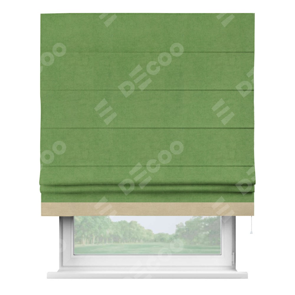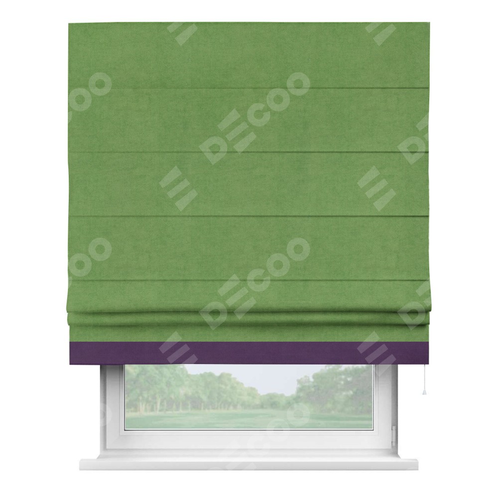 Римская штора производителя «Cortin», используется для проёма, пошита из ткани вельвет салатовый, артикул ткани 87072. Отделка шторы кантом «Джестер», ткань для канта используется из вельвета разной расцветки на выбор. Имеет универсальный механизм и подходит для монтажа: на потолок, на стену и в нишу.