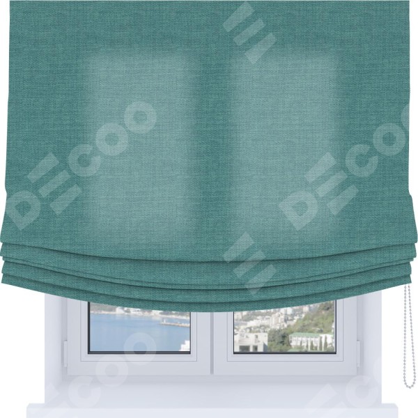 Римская штора Soft производителя «Cortin», используется для проёма, пошита из ткани лён бирюза, артикул ткани 7446. Имеет универсальный механизм и подходит для монтажа: на потолок, на стену и в нишу. В отличие от стандартных римских штор, римская штора Soft не имеет горизонтальных вставок и нижнего отвеса. Это позволяет ткани произвольно драпироваться в свободные мягкие складки.
