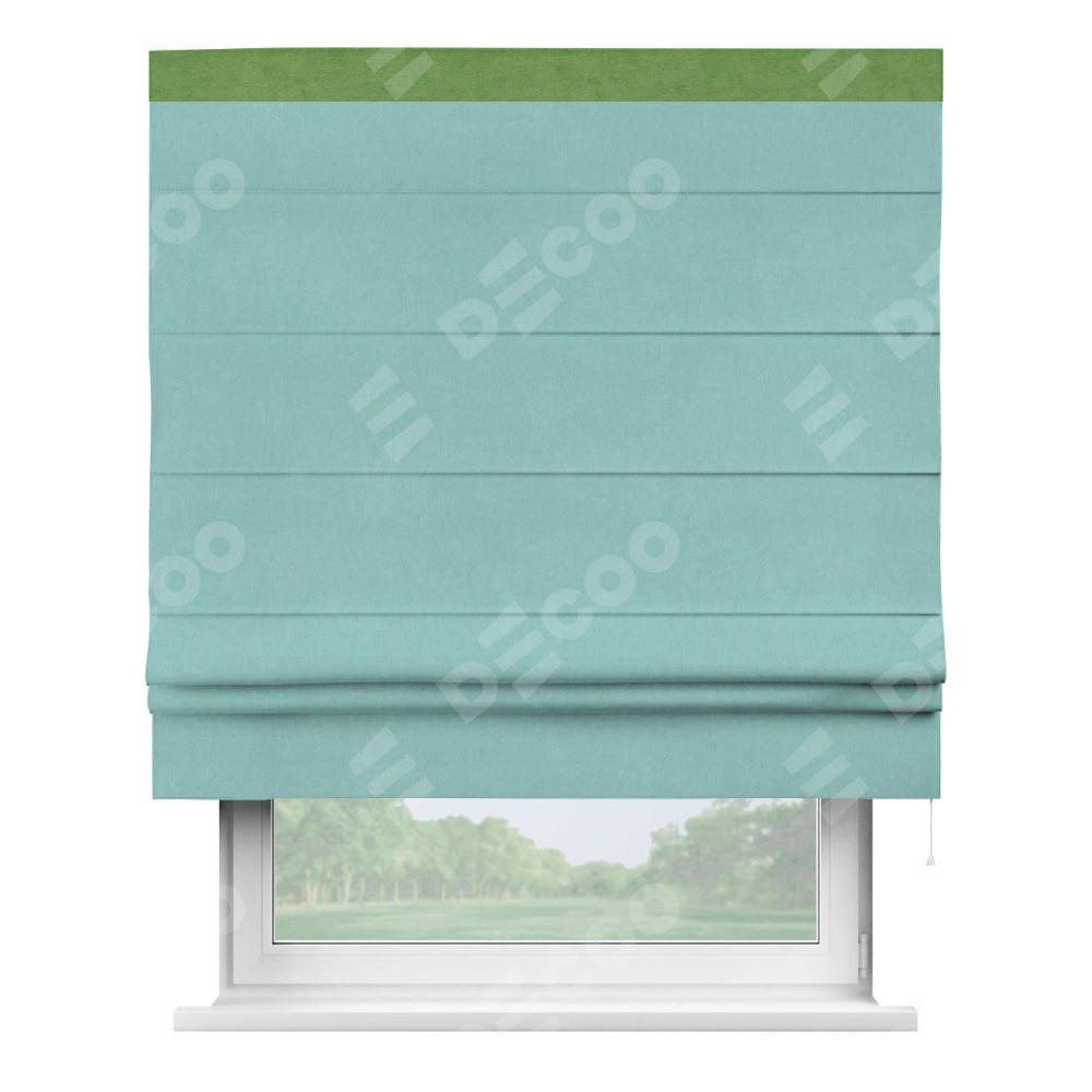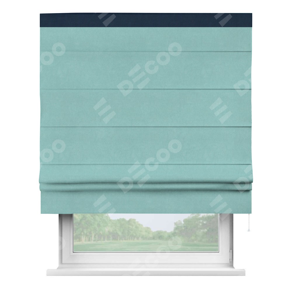 Римская штора производителя «Cortin», используется для проёма, пошита из ткани вельвет тиффани, артикул ткани 17765. Отделка шторы кантом «Кинг», ткань для канта используется из вельвета разной расцветки на выбор. Имеет универсальный механизм и подходит для монтажа: на потолок, на стену и в нишу.