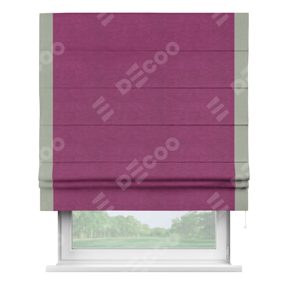 Римская штора производителя «Cortin», используется для проёма, пошита из ткани вельвет фиолетовый, артикул ткани 85552. Отделка шторы кантом «Стрим Дуо», ткань для канта используется из вельвета разной расцветки на выбор. Имеет универсальный механизм и подходит для монтажа: на потолок, на стену и в нишу.