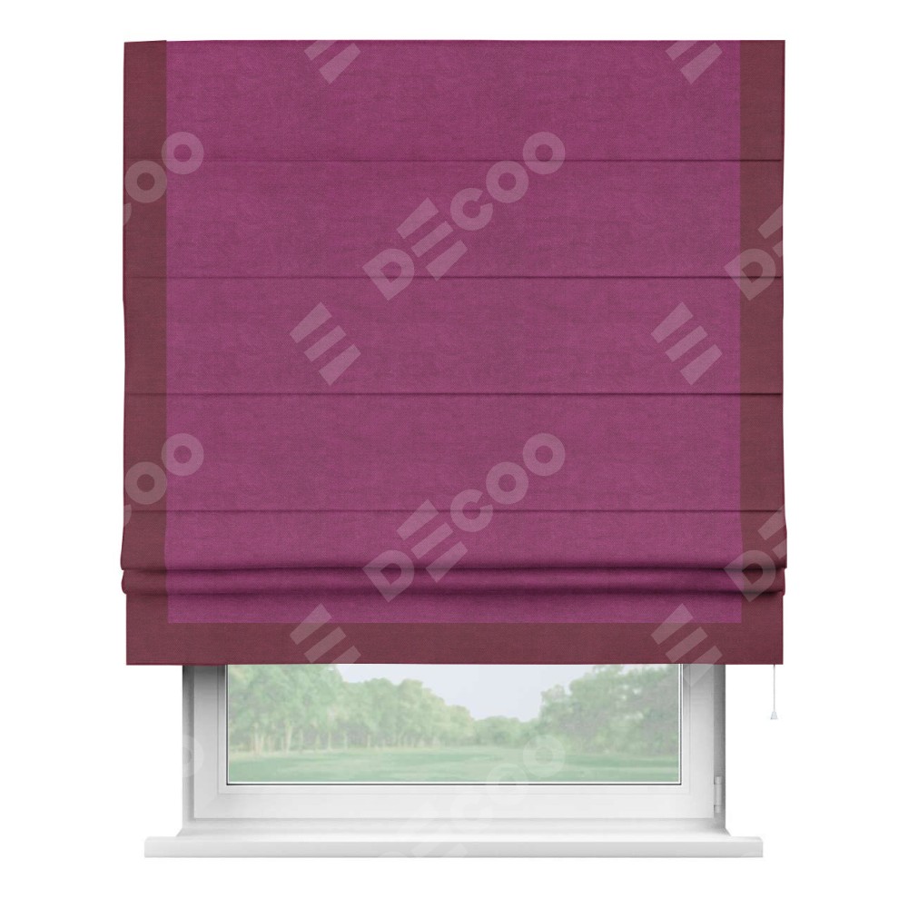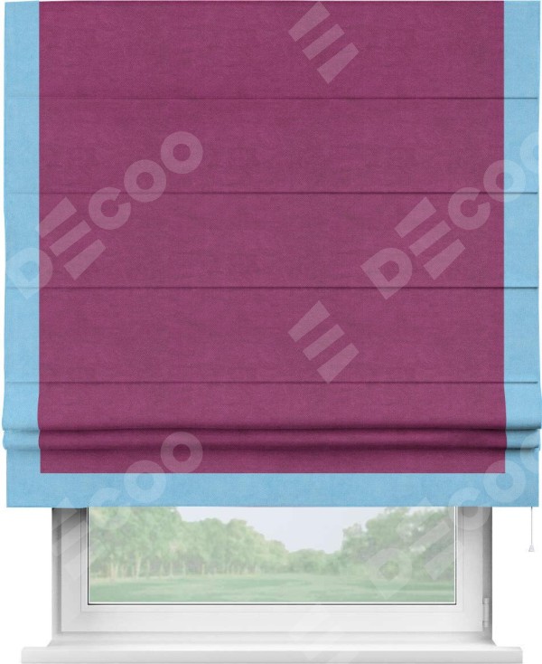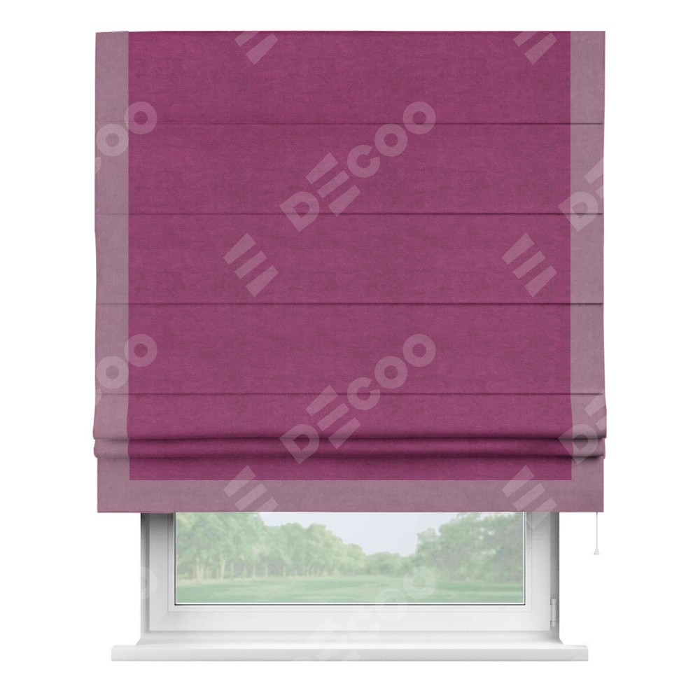 Римская штора производителя «Cortin», используется для проёма, пошита из ткани вельвет фиолетовый, артикул ткани 85552. Отделка шторы кантом «Виктория», ткань для канта используется из вельвета разной расцветки на выбор. Имеет универсальный механизм и подходит для монтажа: на потолок, на стену и в нишу.