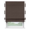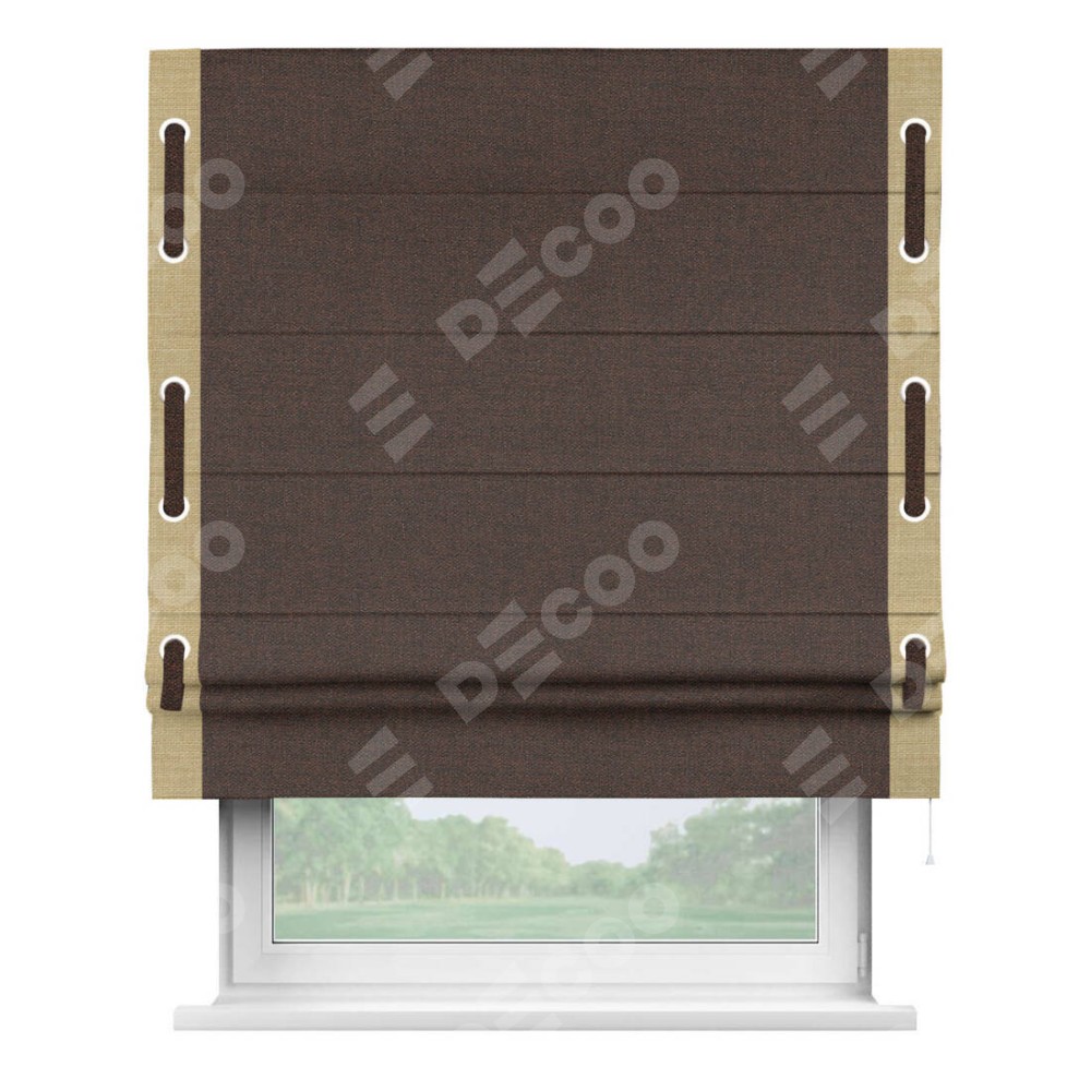 Римская штора производителя «Cortin», используется для проёма, пошита из ткани лён коричневый, артикул 53443. Отделка шторы кантом «Стрим Дуо» на кантах расположены люверсы с пояском, ткань для канта используется из льна разной расцветки на выбор. Ткань для пояска обычно используется из основной ткани шторы, а так же можно сделать из любой расцветки по желанию. Имеет универсальный механизм и подходит для монтажа: на потолок, на стену и в нишу.