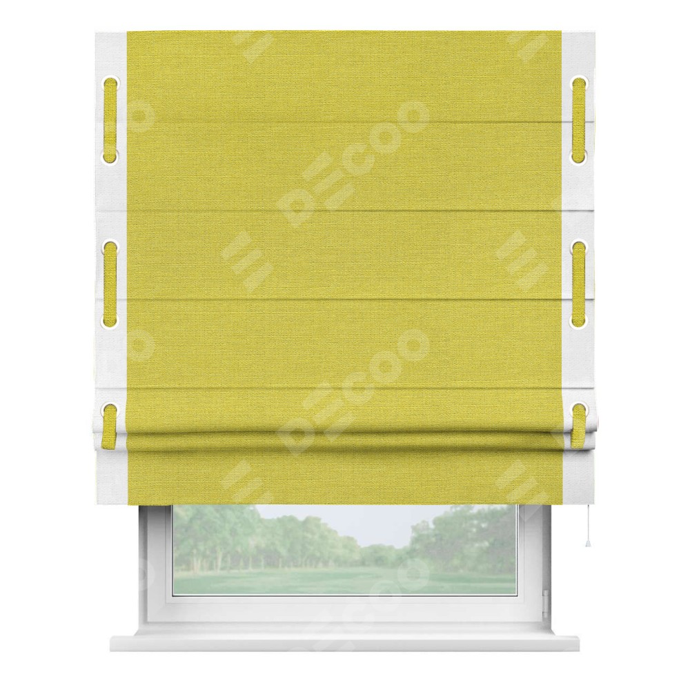 Римская штора производителя «Cortin», используется для проёма, пошита из ткани лён салатовый, артикул 53437. Отделка шторы кантом «Стрим Дуо» на кантах расположены люверсы с пояском, ткань для канта используется из льна разной расцветки на выбор. Ткань для пояска обычно используется из основной ткани шторы, а так же можно сделать из любой расцветки по желанию. Имеет универсальный механизм и подходит для монтажа: на потолок, на стену и в нишу.