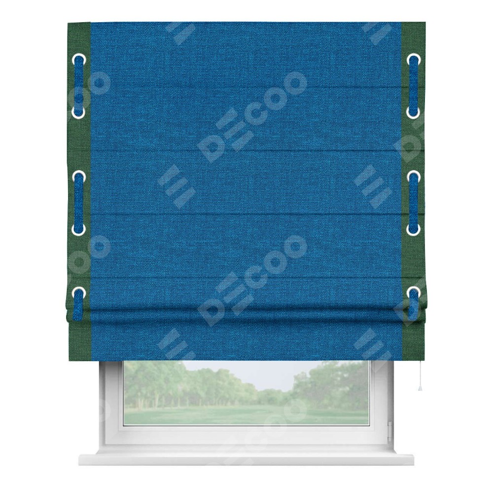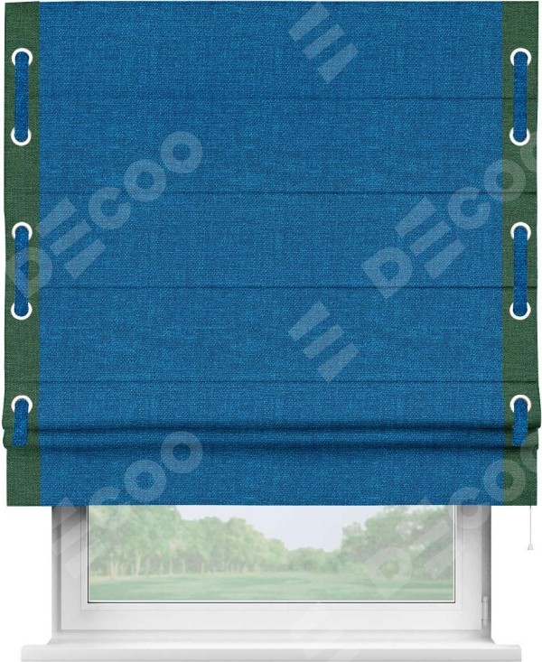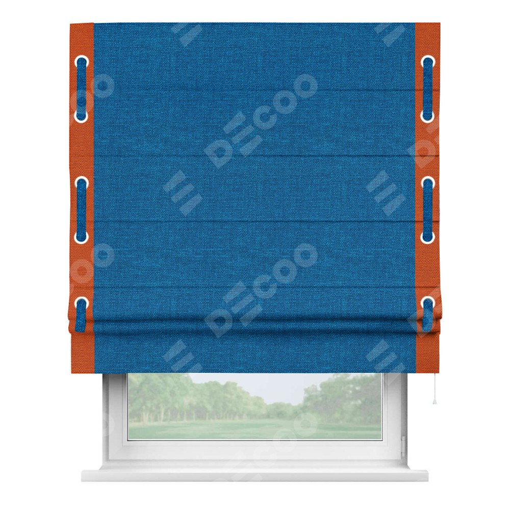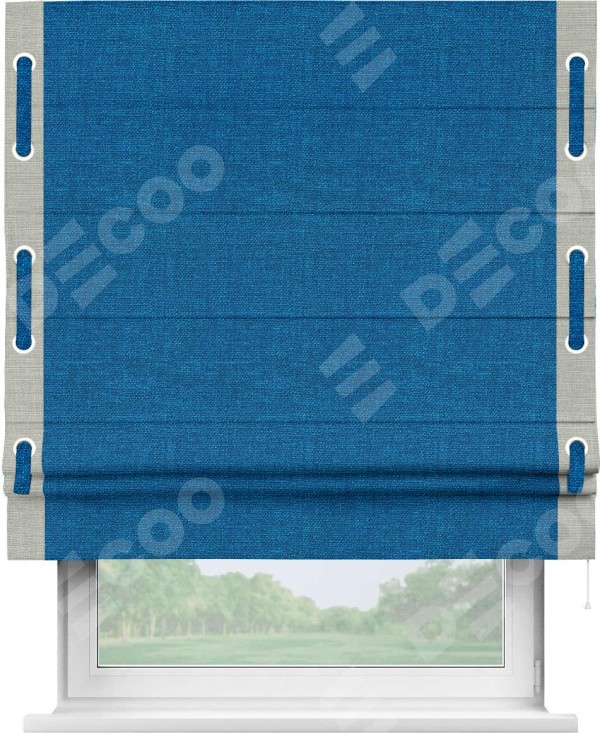 Римская штора производителя «Cortin», используется для проёма, пошита из ткани лён синий, артикул 63742. Отделка шторы кантом «Стрим Дуо» на кантах расположены люверсы с пояском, ткань для канта используется из льна разной расцветки на выбор. Ткань для пояска обычно используется из основной ткани шторы, а так же можно сделать из любой расцветки по желанию. Имеет универсальный механизм и подходит для монтажа: на потолок, на стену и в нишу.