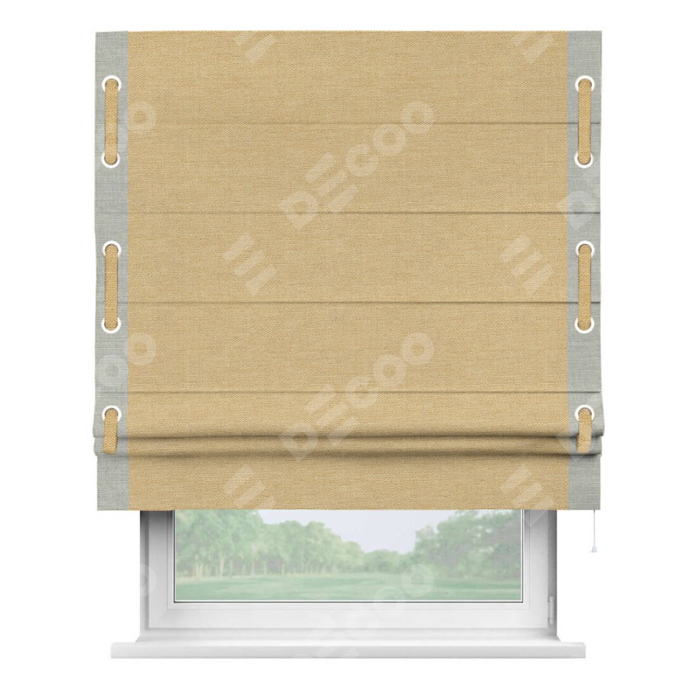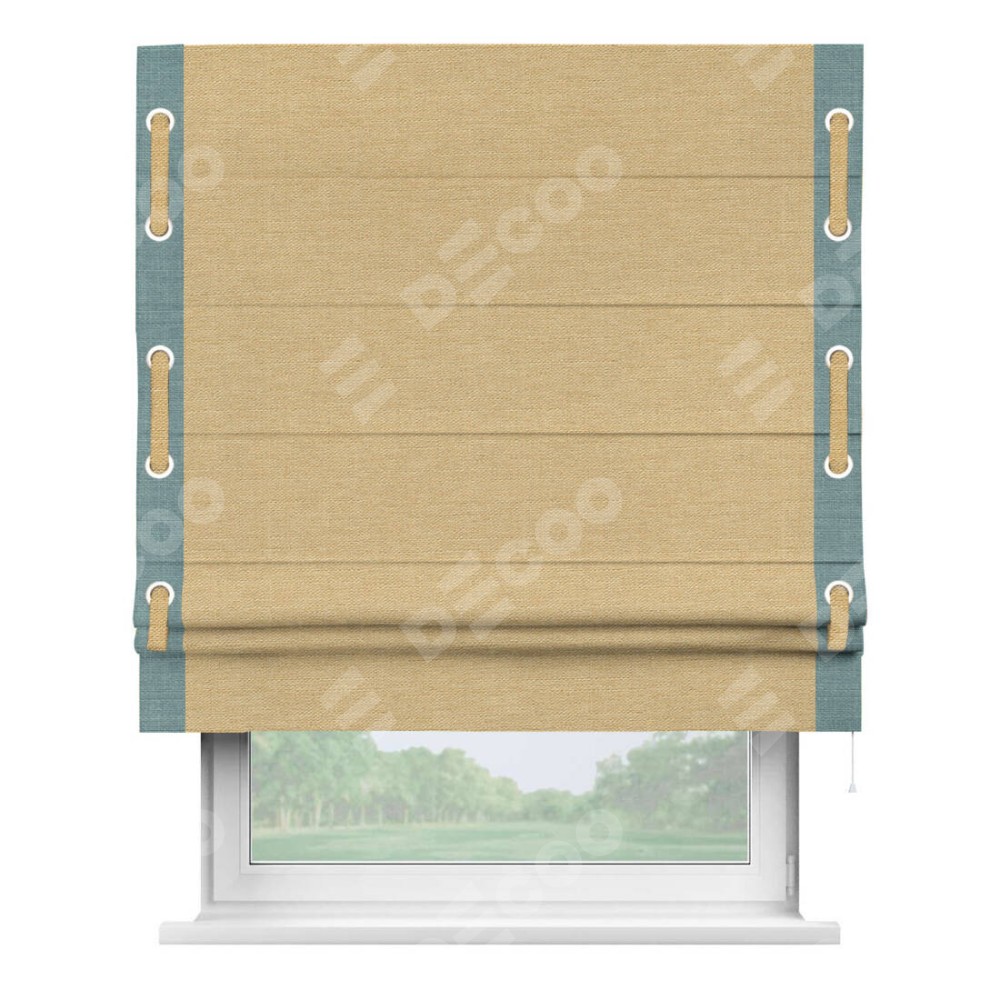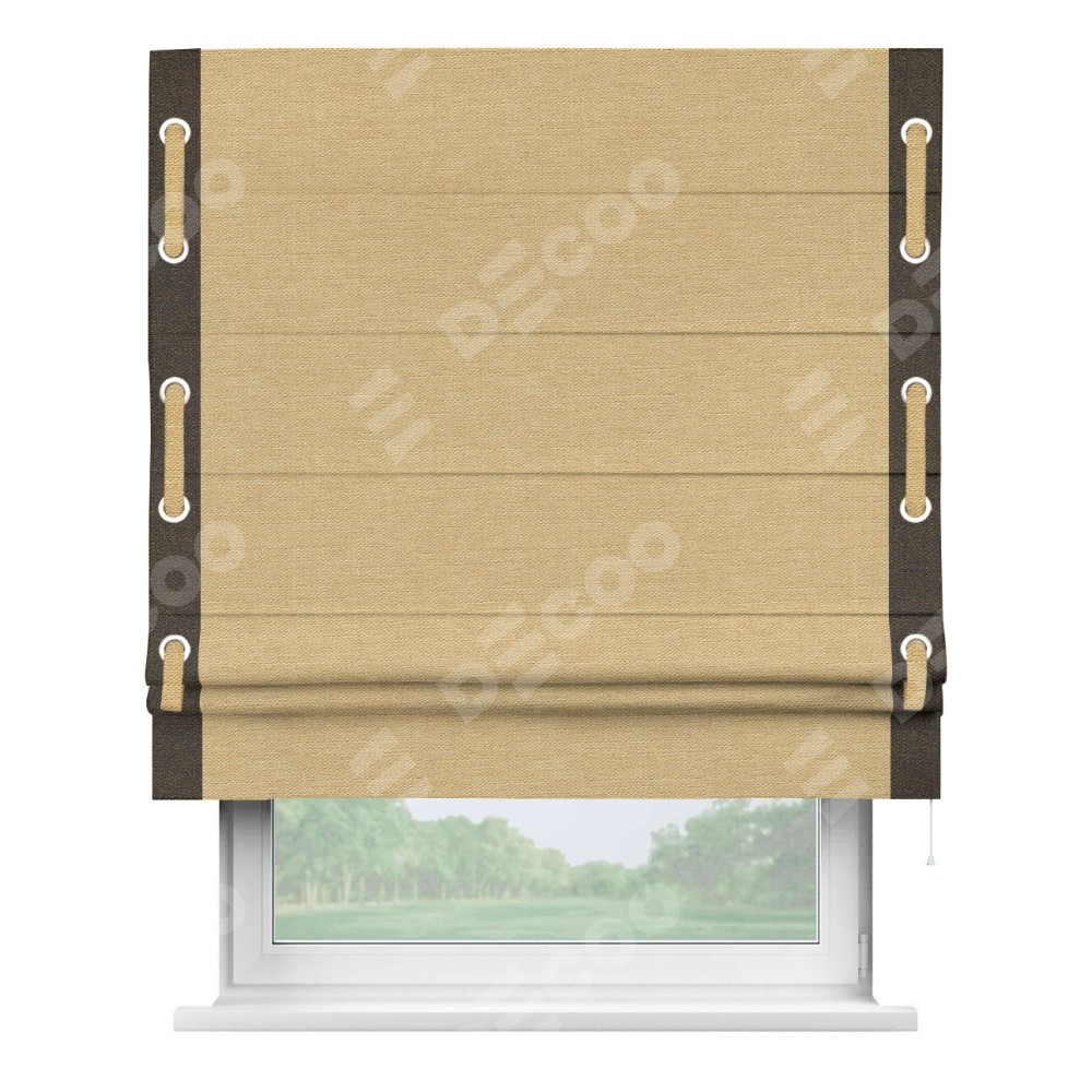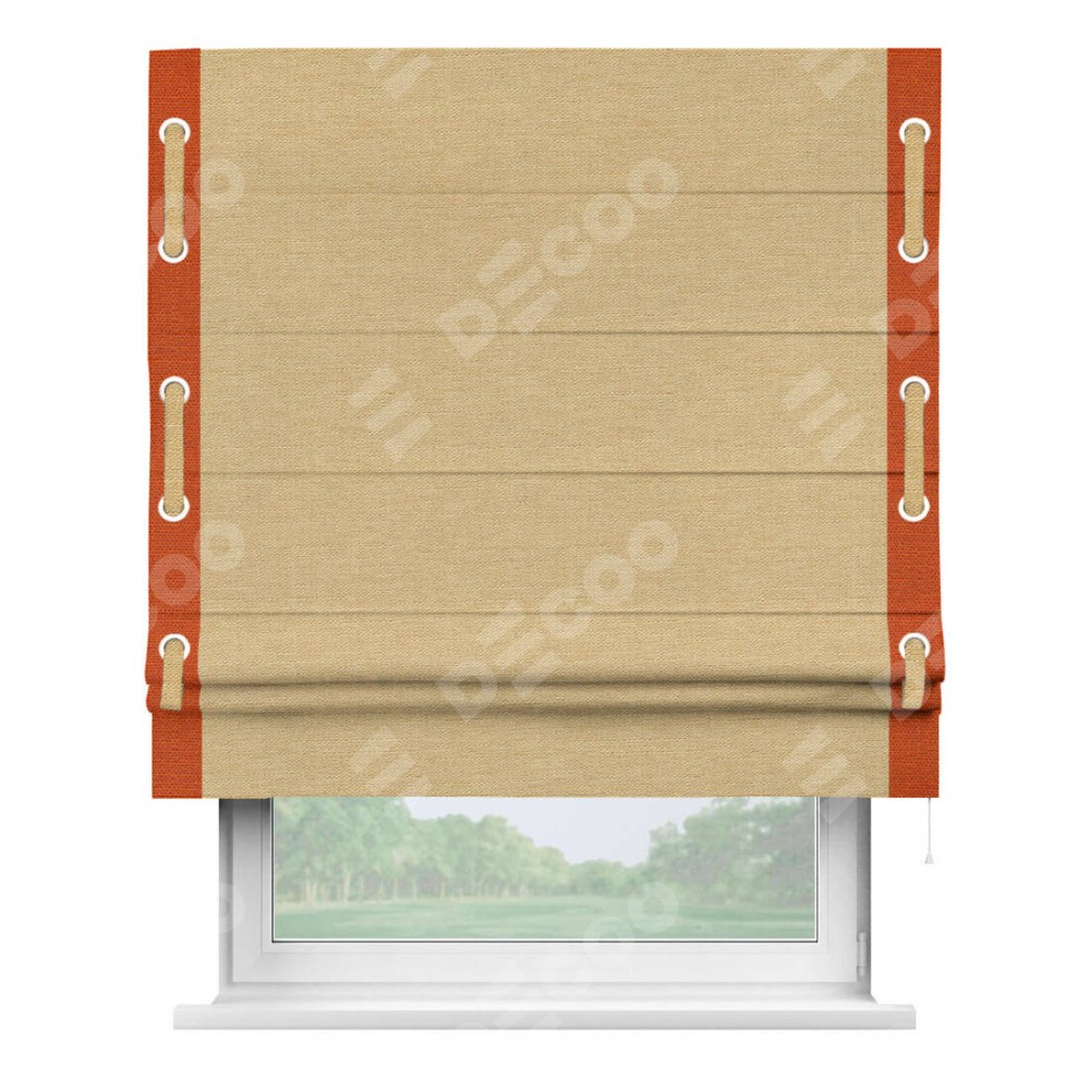 Римская штора производителя «Cortin», используется для проёма, пошита из ткани лён темно-бежевый, артикул 53433. Отделка шторы кантом «Стрим Дуо» на кантах расположены люверсы с пояском, ткань для канта используется из льна разной расцветки на выбор. Ткань для пояска обычно используется из основной ткани шторы, а так же можно сделать из любой расцветки по желанию. Имеет универсальный механизм и подходит для монтажа: на потолок, на стену и в нишу.