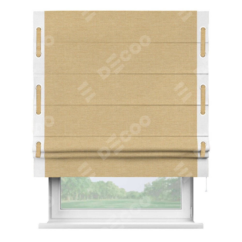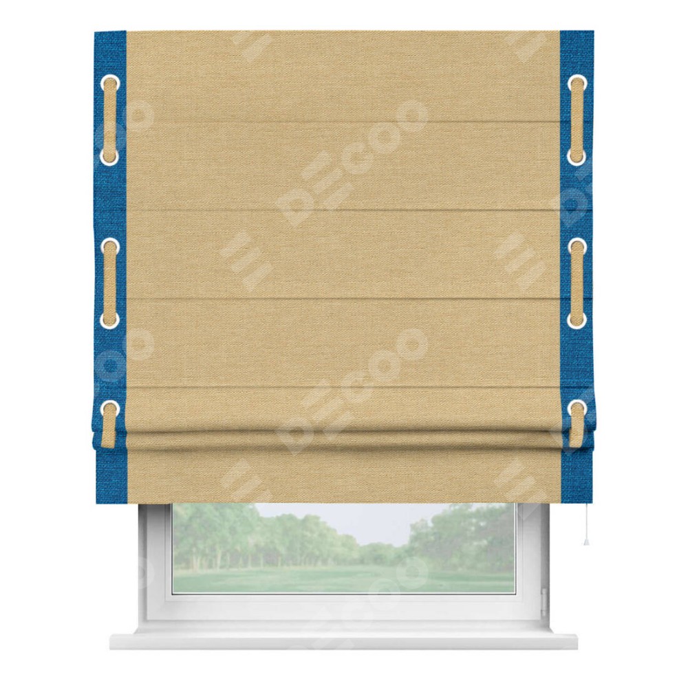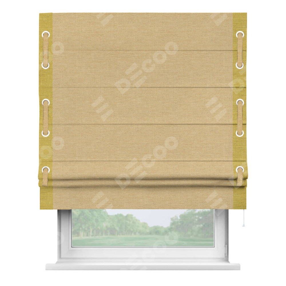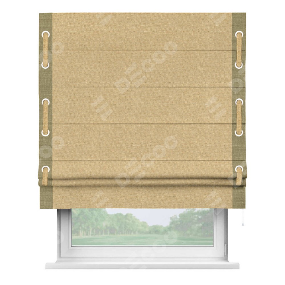 Римская штора производителя «Cortin», используется для проёма, пошита из ткани лён темно-бежевый, артикул 53433. Отделка шторы кантом «Стрим Дуо» на кантах расположены люверсы с пояском, ткань для канта используется из льна разной расцветки на выбор. Ткань для пояска обычно используется из основной ткани шторы, а так же можно сделать из любой расцветки по желанию. Имеет универсальный механизм и подходит для монтажа: на потолок, на стену и в нишу.
