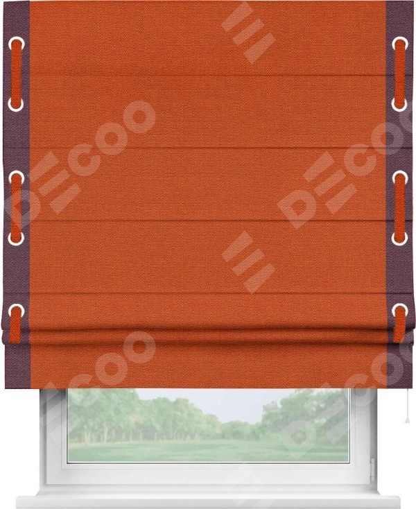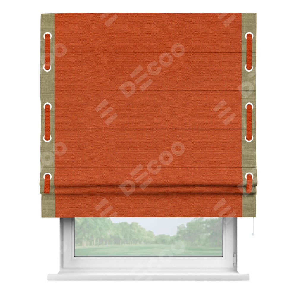 Римская штора производителя «Cortin», используется для проёма, пошита из ткани лён терракотовый, артикул 53440. Отделка шторы кантом «Стрим Дуо» на кантах расположены люверсы с пояском, ткань для канта используется из льна разной расцветки на выбор. Ткань для пояска обычно используется из основной ткани шторы, а так же можно сделать из любой расцветки по желанию. Имеет универсальный механизм и подходит для монтажа: на потолок, на стену и в нишу.