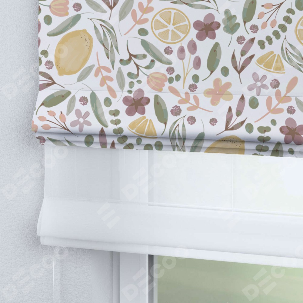 Римская штора день-ночь производителя «Cortin», используется для проёма, пошита из двух полотен, с лицевой блэкаут с нанесением сублимационной печати «Лимоны и цветы», вторая ткань тюль (по стандарту комплектуется тюль белого цвета артикул V-01). Имеет универсальный механизм и подходит для монтажа: на потолок, на стену и в нишу.