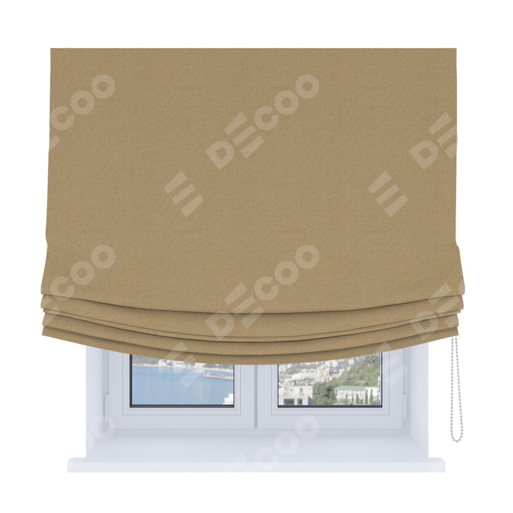 Римская штора Soft производителя «Cortin», используется для проёма, пошита из ткани лён димаут тёмно-бежевый, артикул ткани 83037. Имеет универсальный механизм и подходит для монтажа: на потолок, на стену и в нишу. В отличие от стандартных римских штор, римская штора Soft не имеет горизонтальных вставок и нижнего отвеса. Это позволяет ткани произвольно драпироваться в свободные мягкие складки.